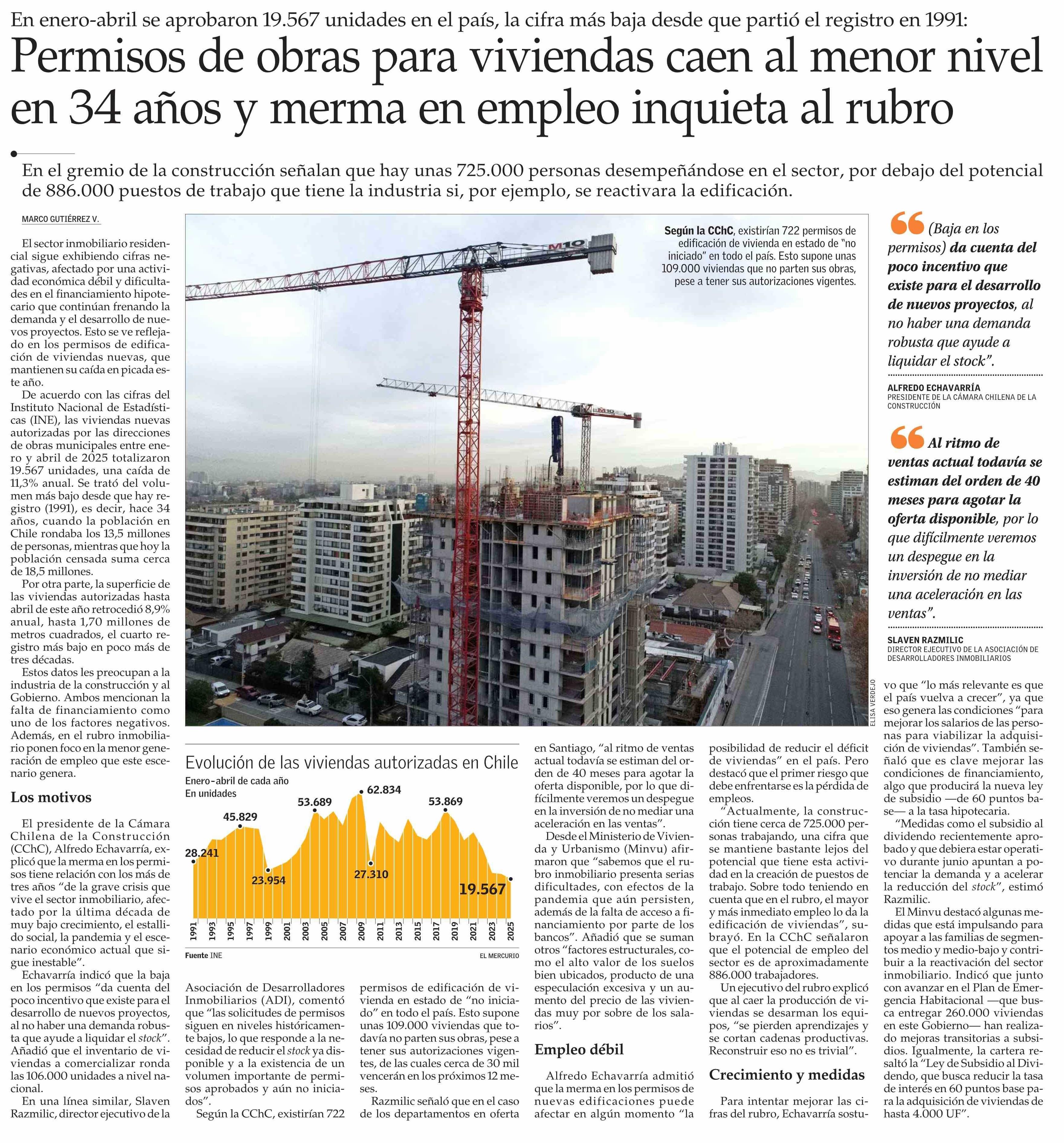 Permisos de obras para viviendas caen al menor nivel en 34 años y merma en empleo inquieta al rubro 09-06-2025 El Mercurio |