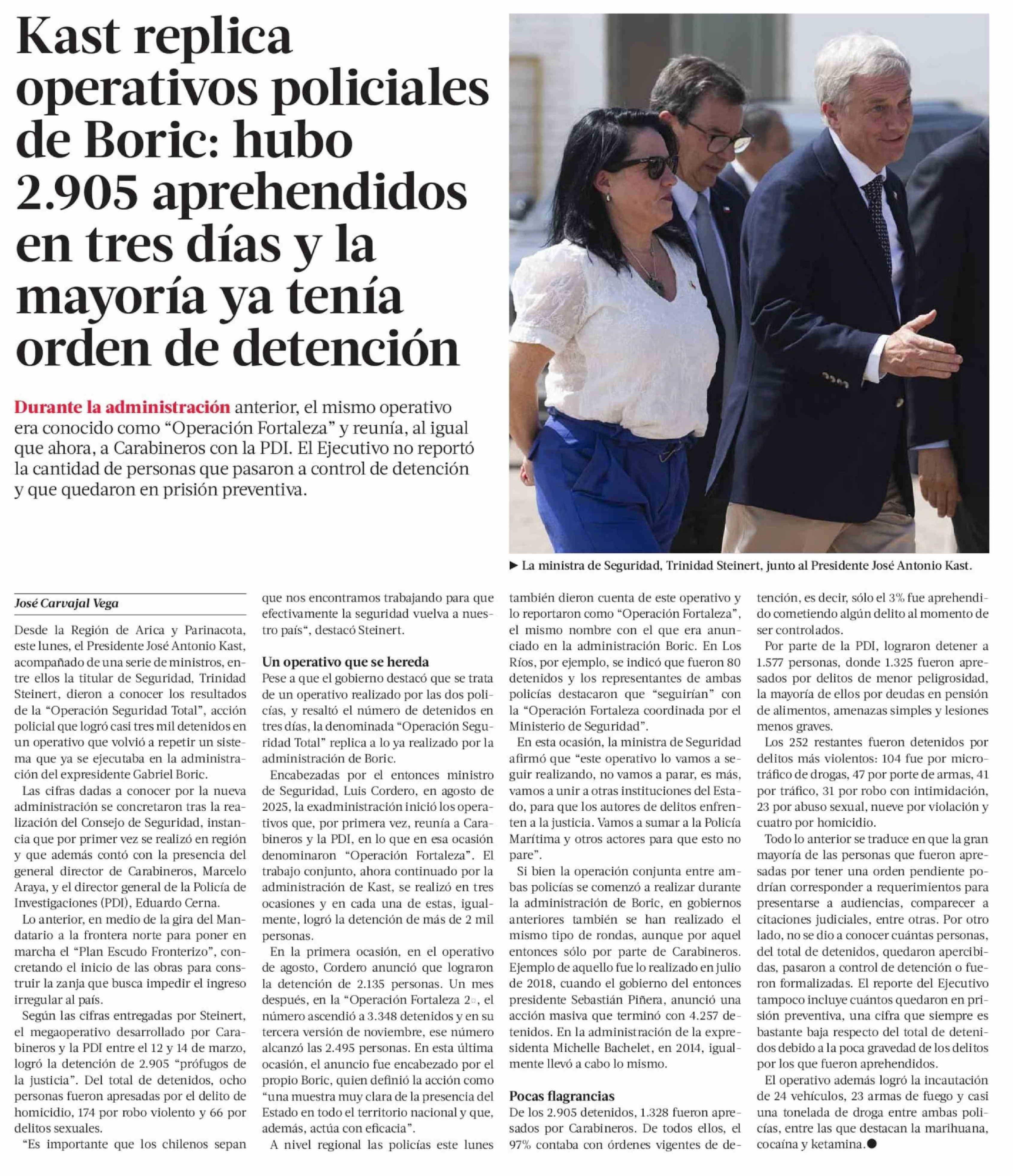 Kast replica operativos policiales de Boric: hubo 2.905 aprehendidos en tres días y la mayoría ya tenía orden de detención 17-03-2026 La Tercera |