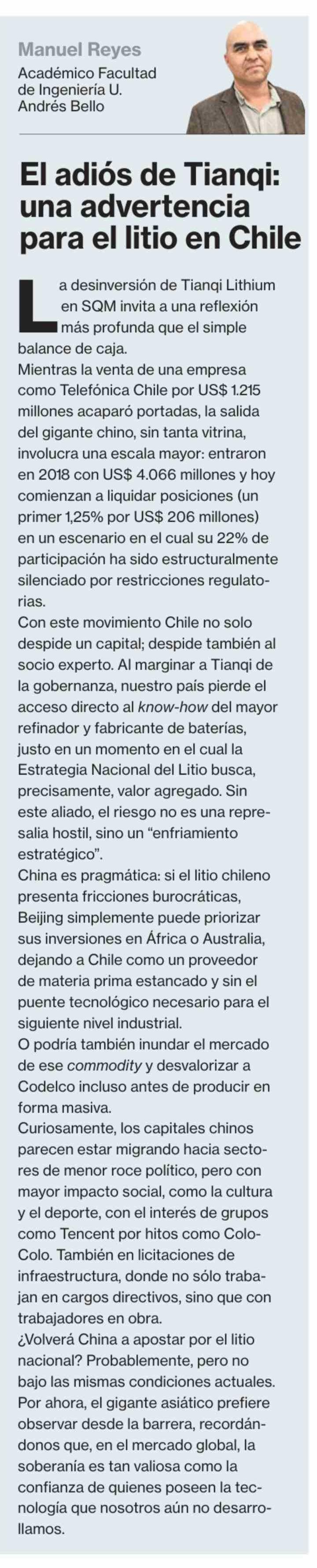Columnas de Opinión: El adiós de Tianqi: una advertencia para el litio en Chile 20-02-2026 La Segunda |