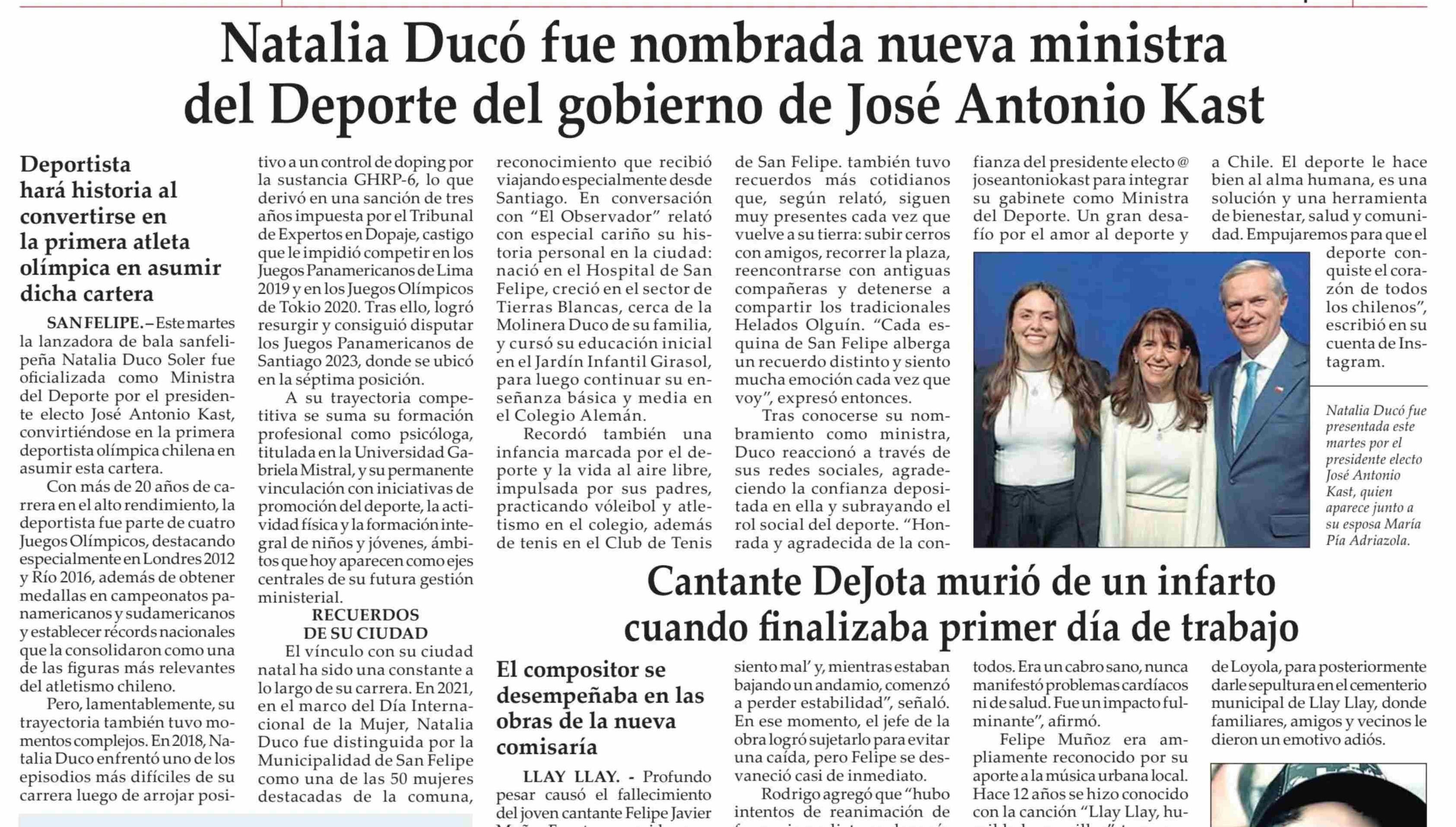 Natalia Ducó fue nombrada nueva ministra del Deporte del gobierno de José Antonio Kast 23-01-2026 El Observador |