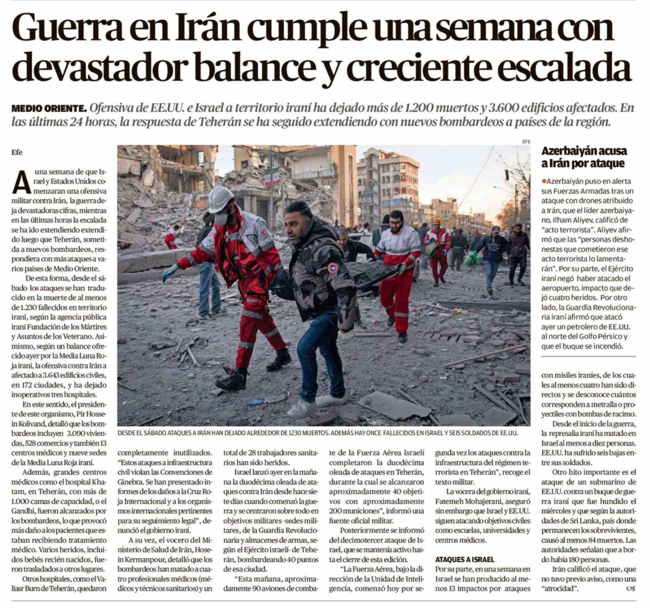 | Título: | Guerra en Iran cumple una semana con devastador balance y creciente escalada |