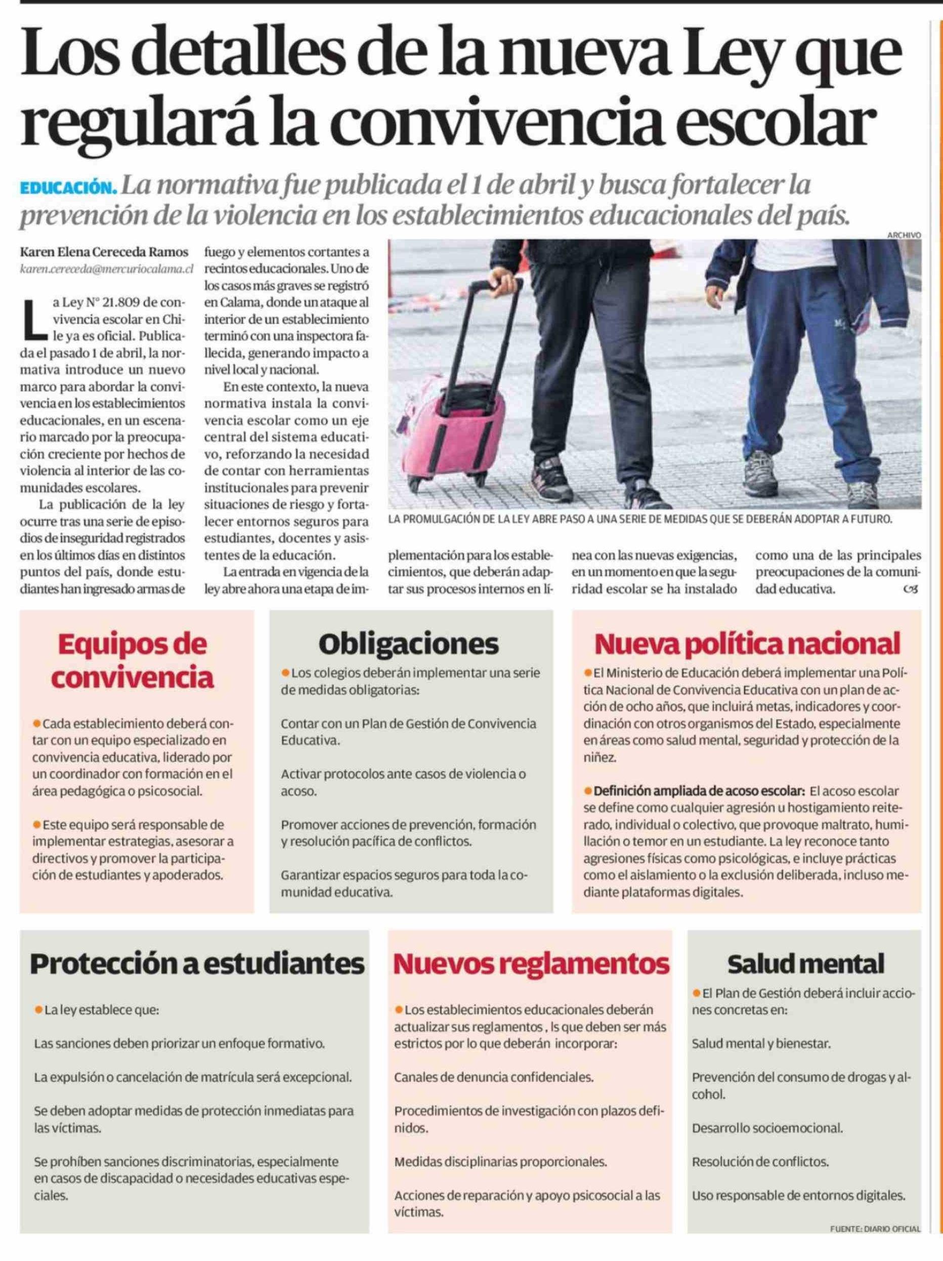 Los detalles de la nueva Ley que regulará la convivencia escolar 05-04-2026 El Mercurio de Calama |