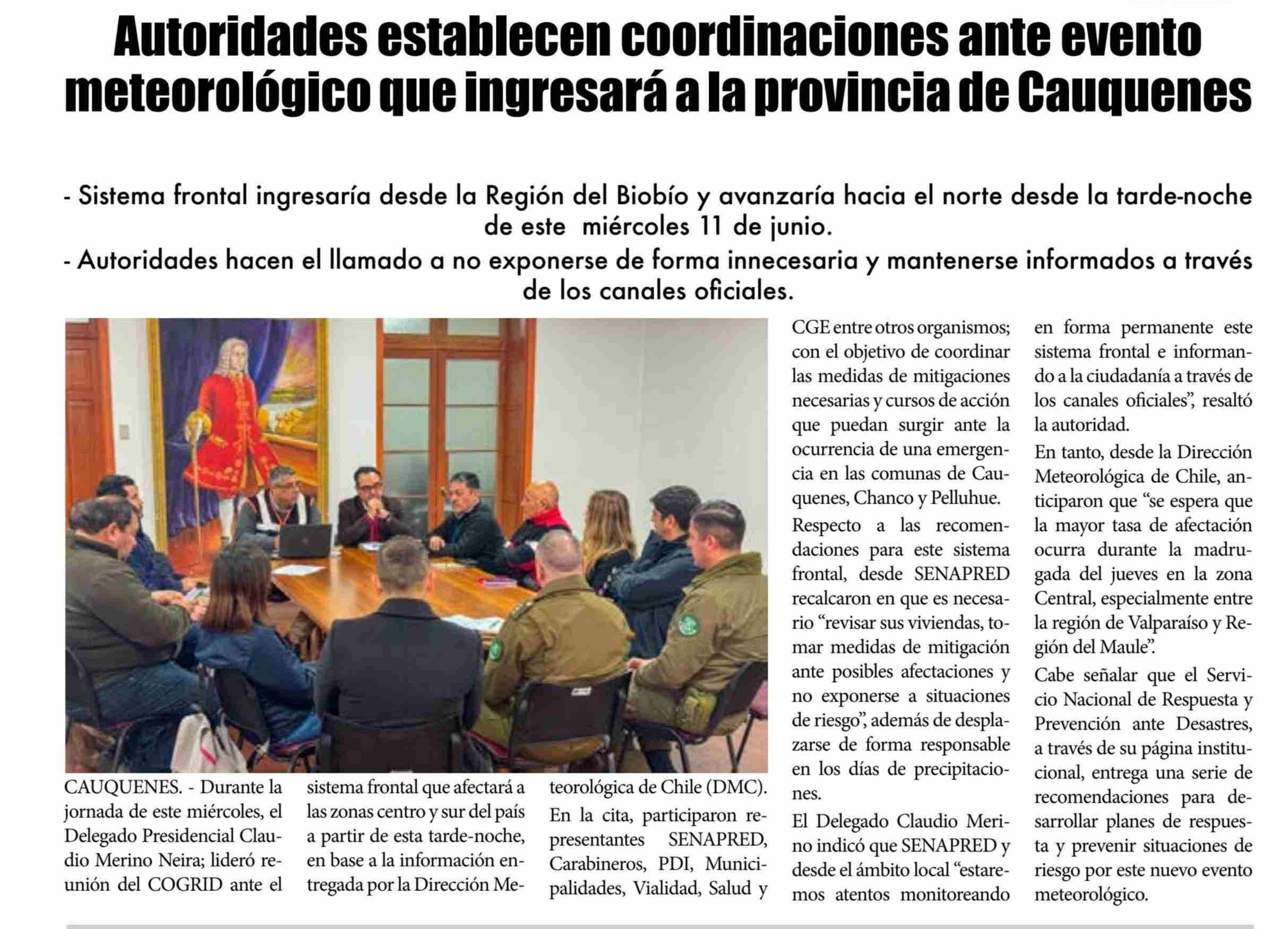 Autoridades establecen coordinaciones ante evento meteorológico que ingresará ala provincia de Cauquenes 12-06-2025 El Lector |