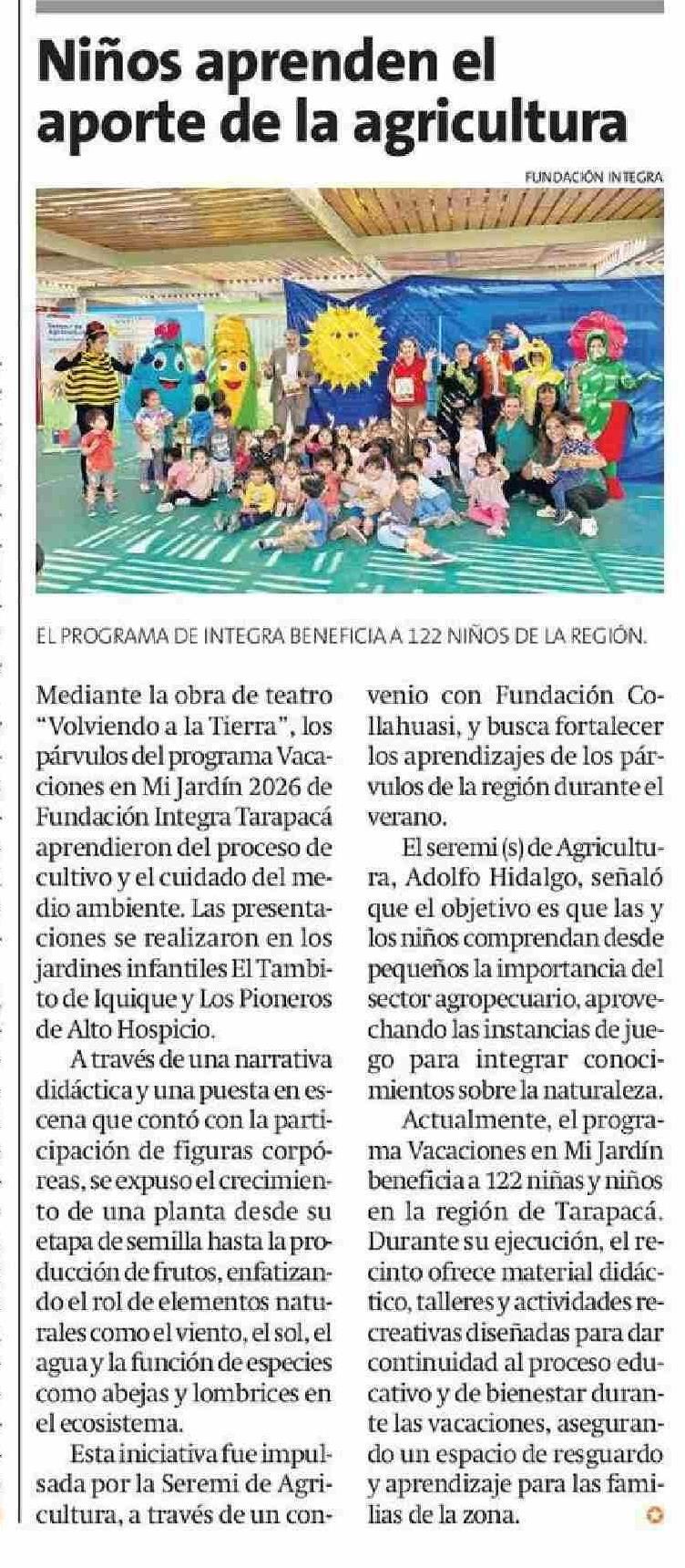 Niños aprenden el aporte de la agricultura 18-01-2026 La Estrella de Iquique |