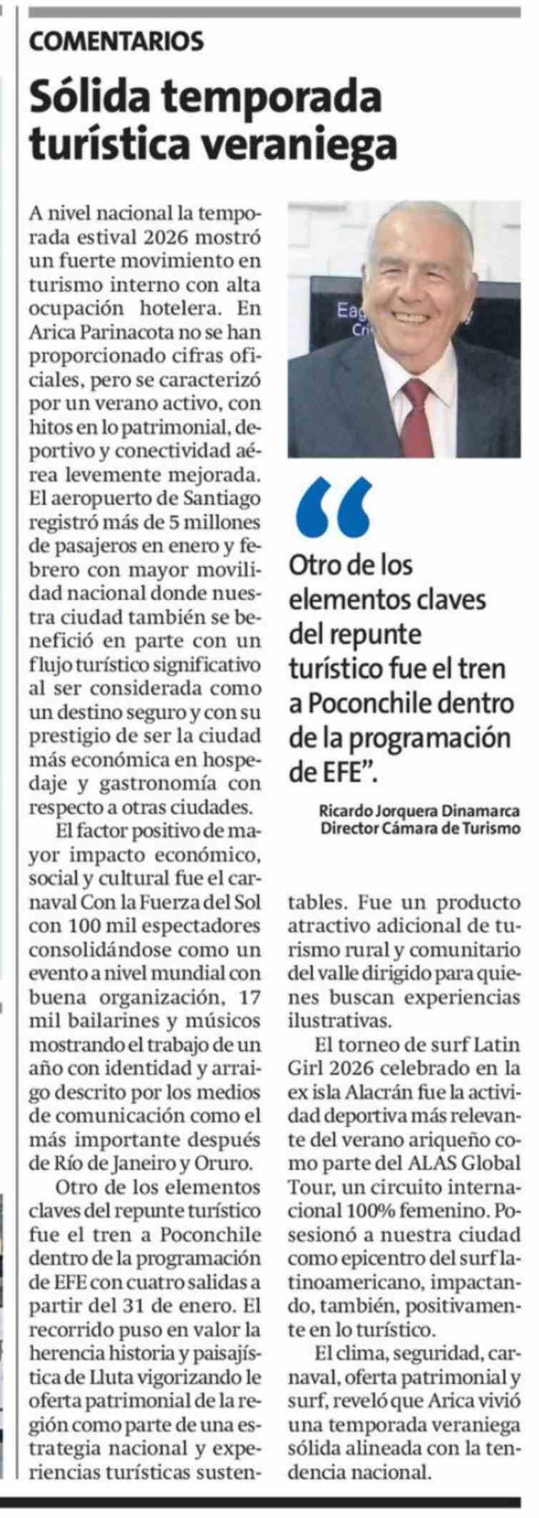 Columnas de Opinión: Sólida temporada turística veraniega 10-03-2026 La Estrella de Arica |
