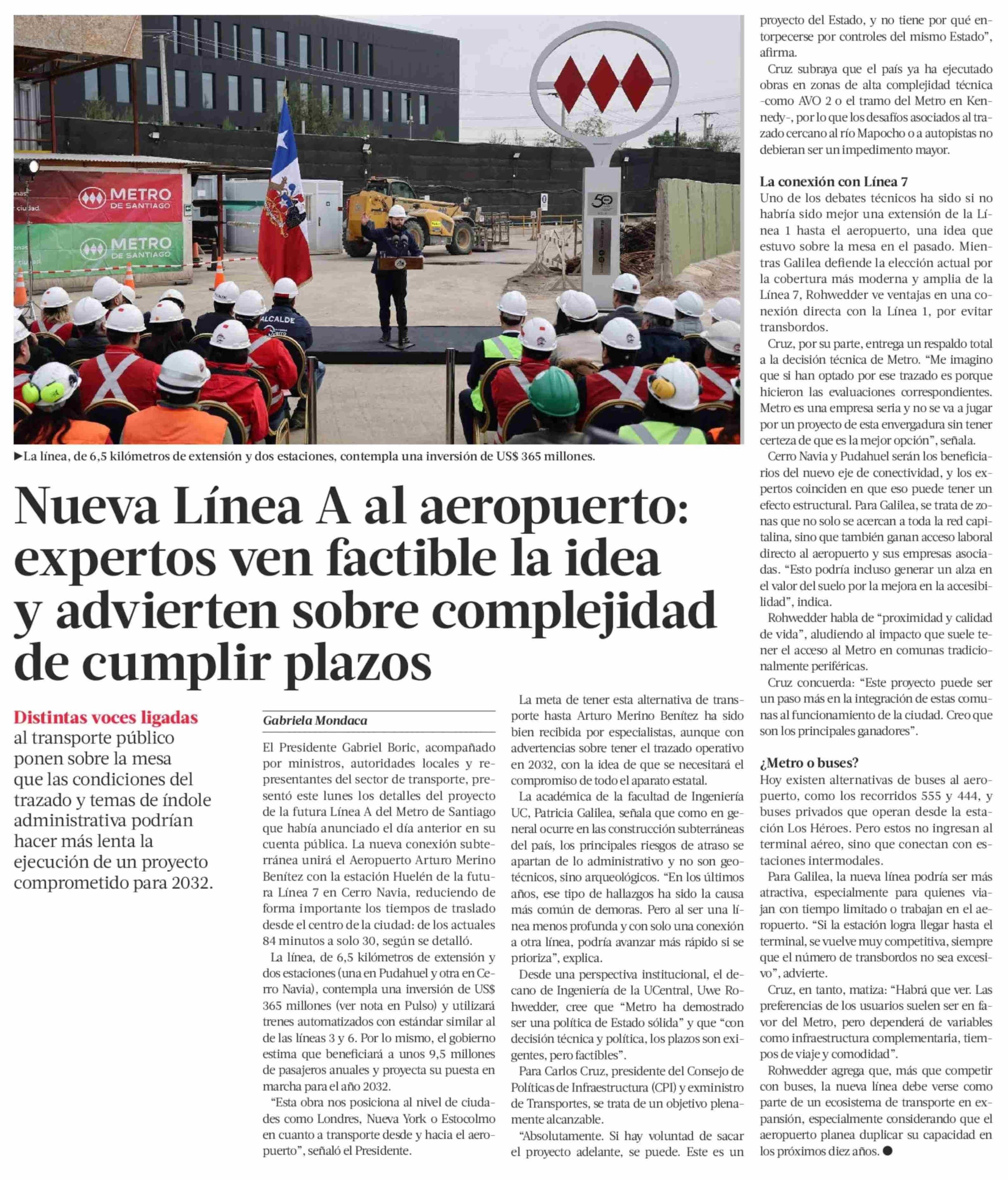 Nueva Línea A Al aeropuerto: expertos ven factible la idea y advierten sobre complejidad de cumplir plazos 03-06-2025 La Tercera |