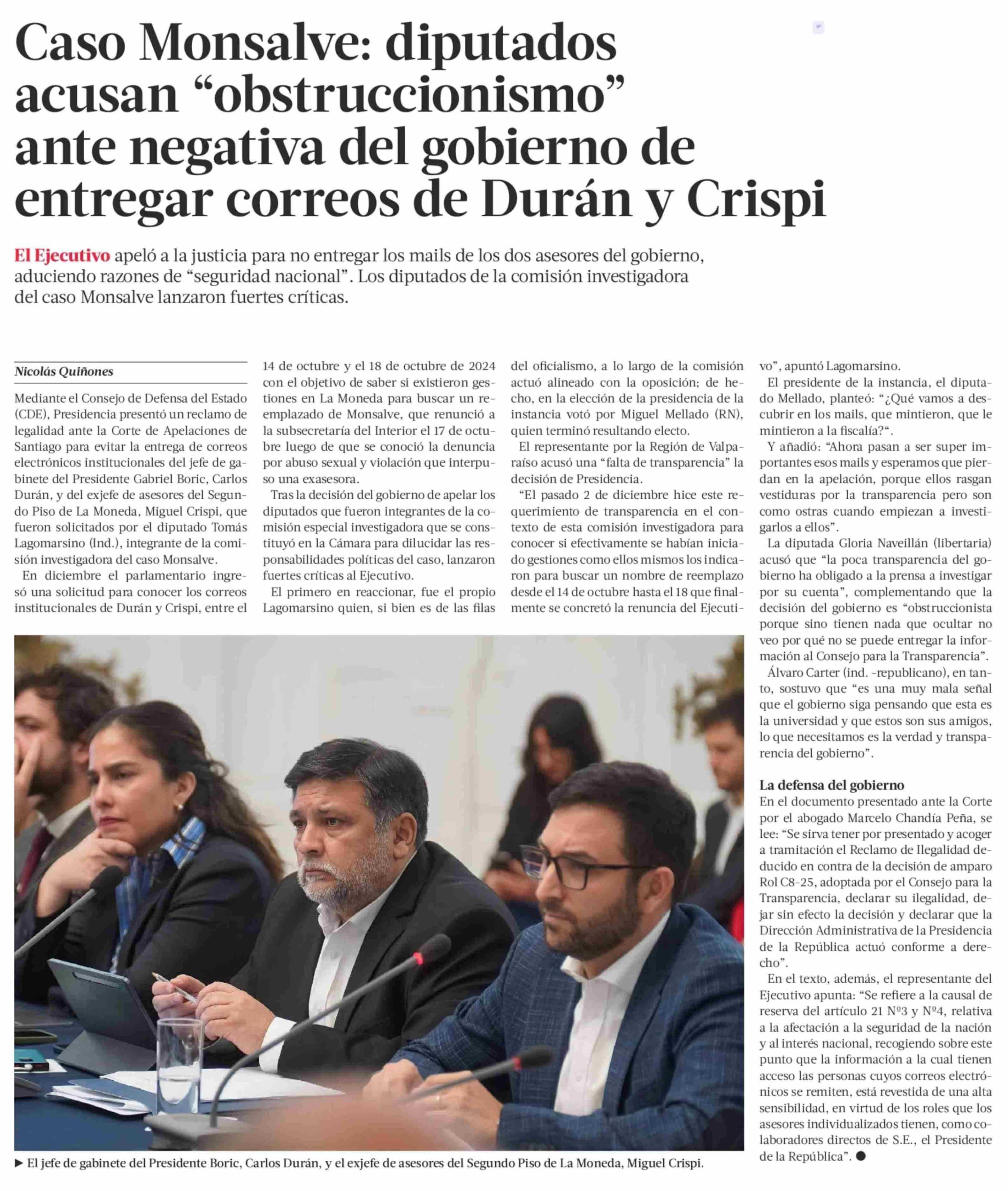 Caso Monsalve: diputados acusan “obstruccionismo” ante negativa del gobierno de entregar correos de Durán y Crispi 29-05-2025 La Tercera |