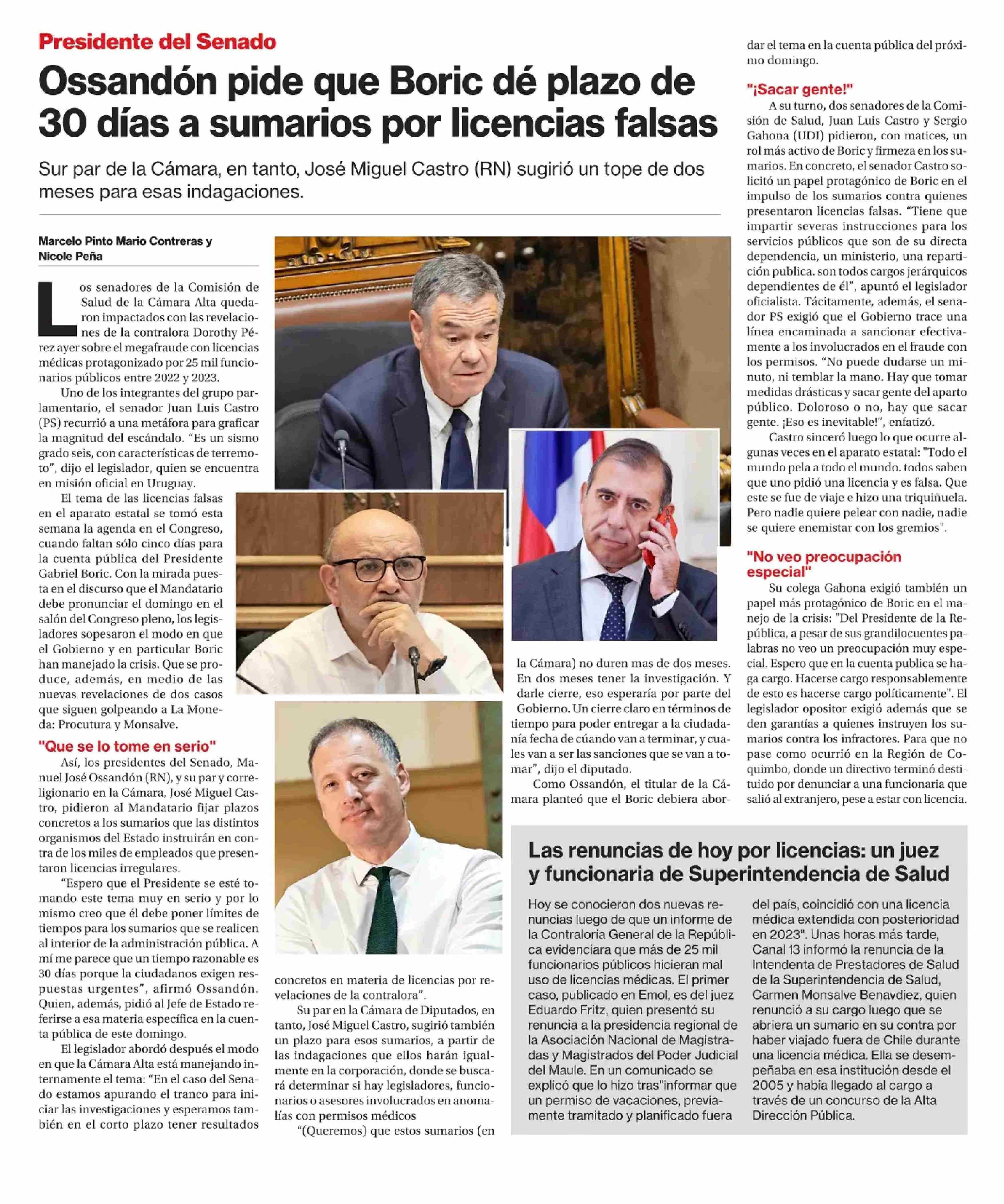 Ossandón pide que Boric dé plazo de 30 días a sumarios por licencias falsas 27-05-2025 La Segunda |