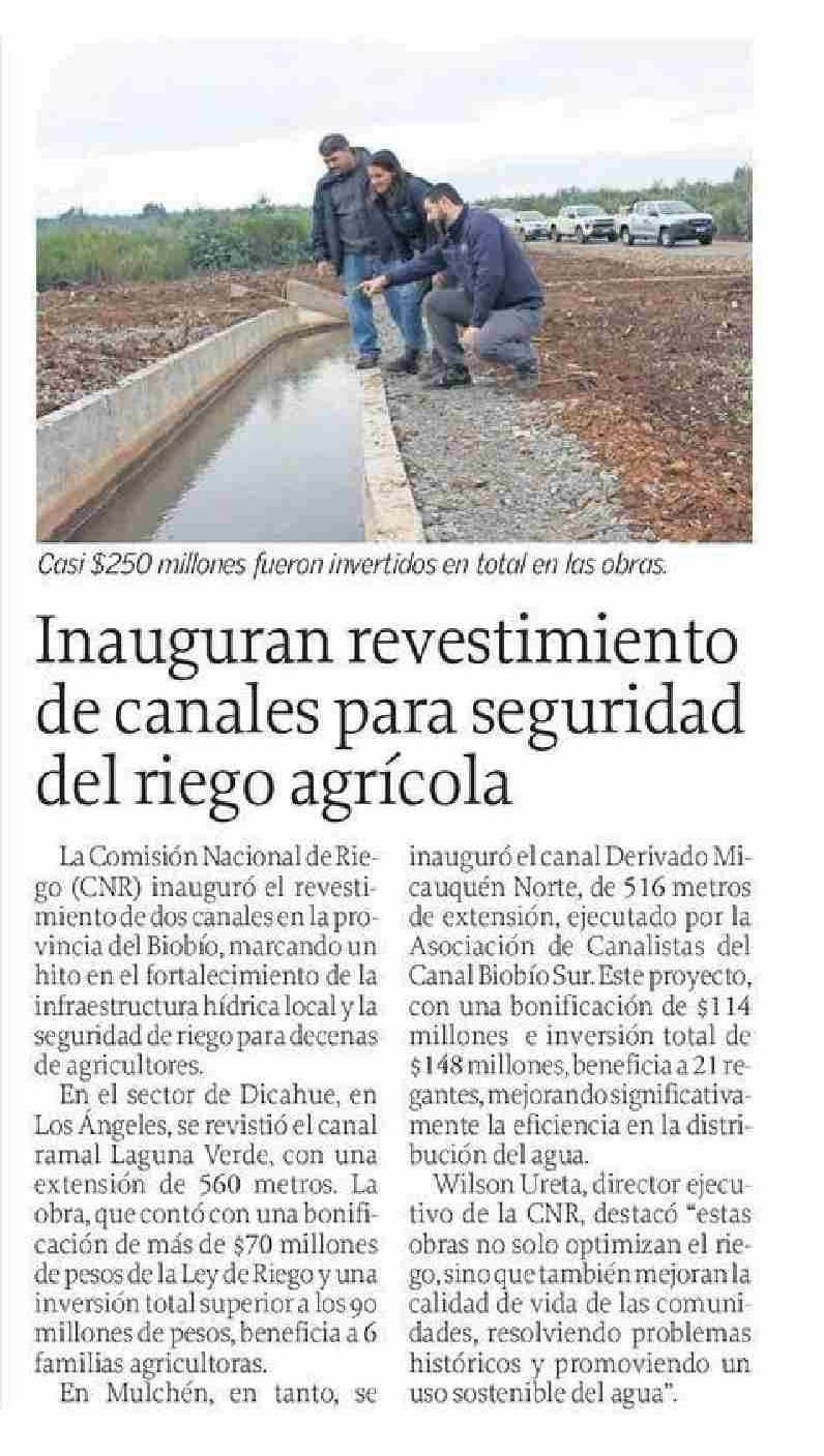 Inauguran revestimiento de canales para seguridad del riego agrícola 19-05-2025 El Sur |