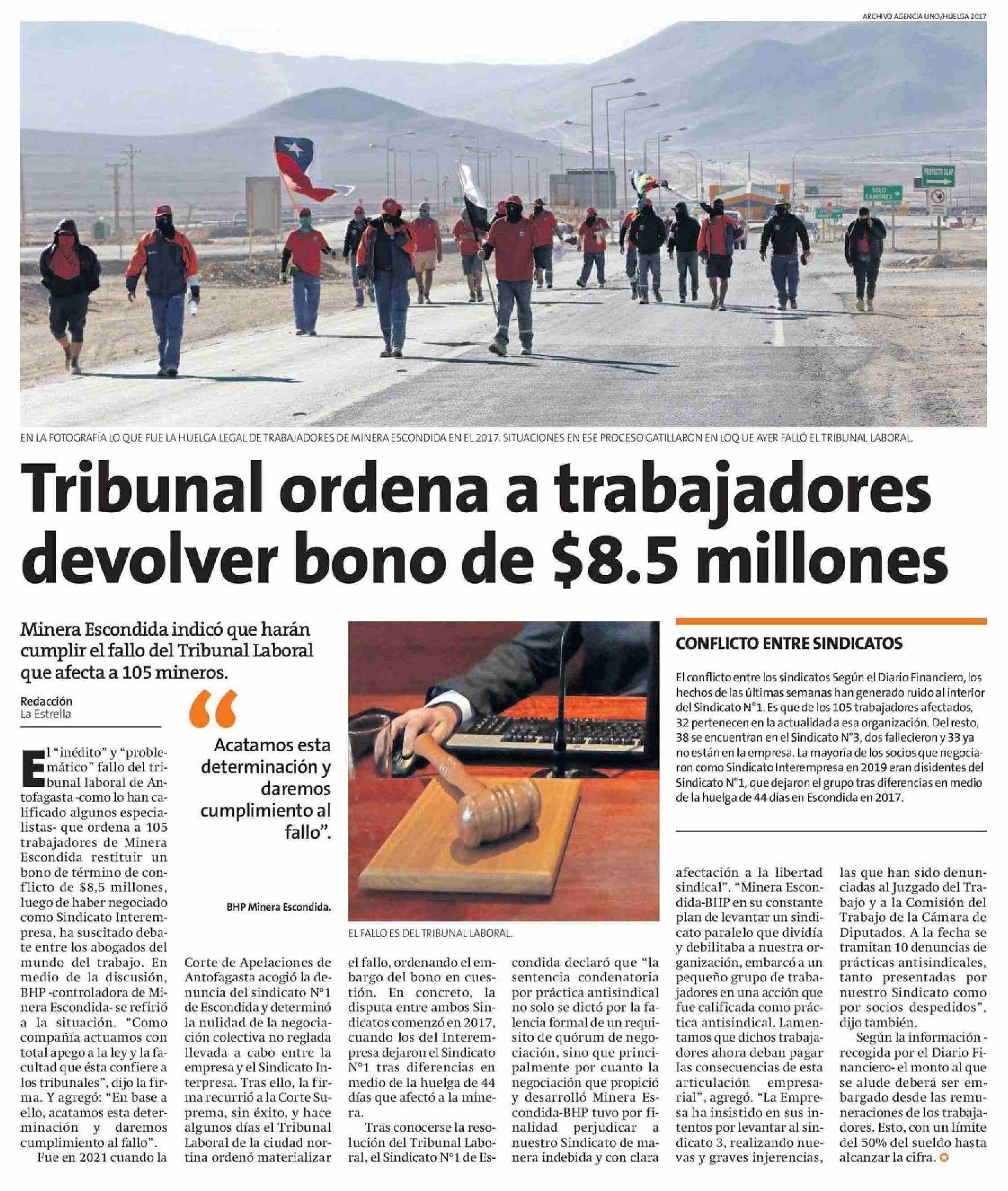 Tribunal ordena a trabajadores devolver bono de $8.5 millones 11-06-2025 La Estrella de Antofagasta |