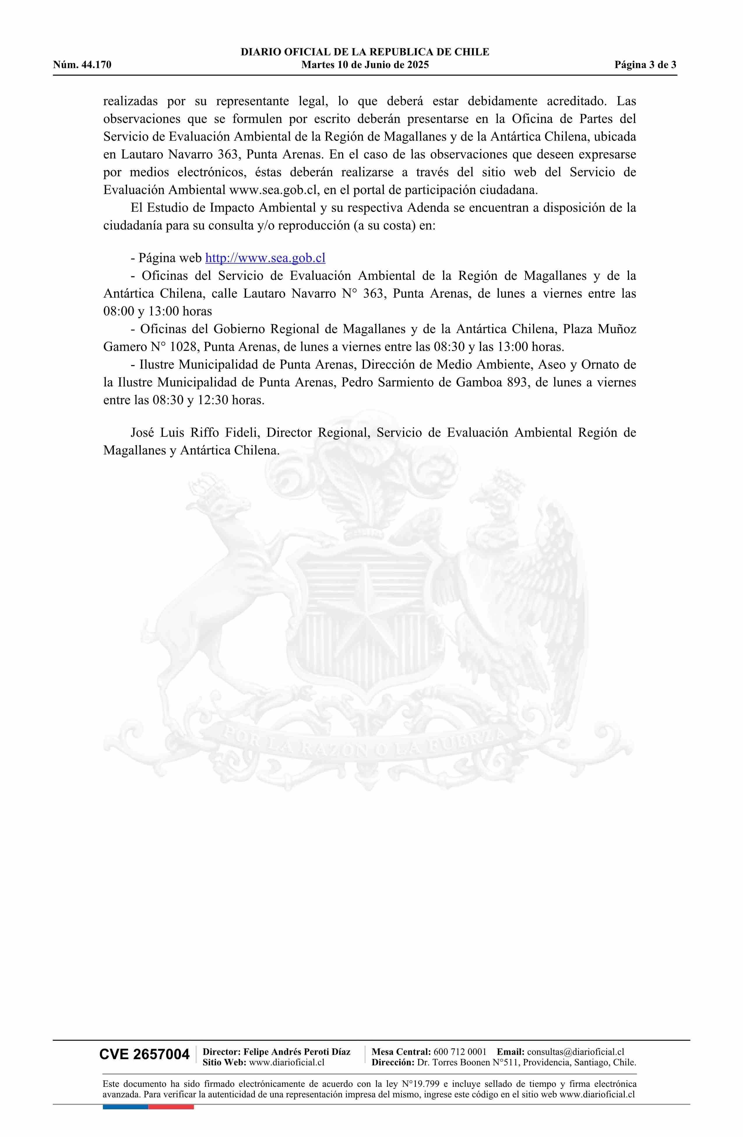 | Título: | Extracto de resolución exenta número 20251200139, de 2025.- Inicia nueva etapa de participación ciudadana por Adenda al Estudio de Impacto Ambiental del proyecto Parque Eólico Faro del Sur |