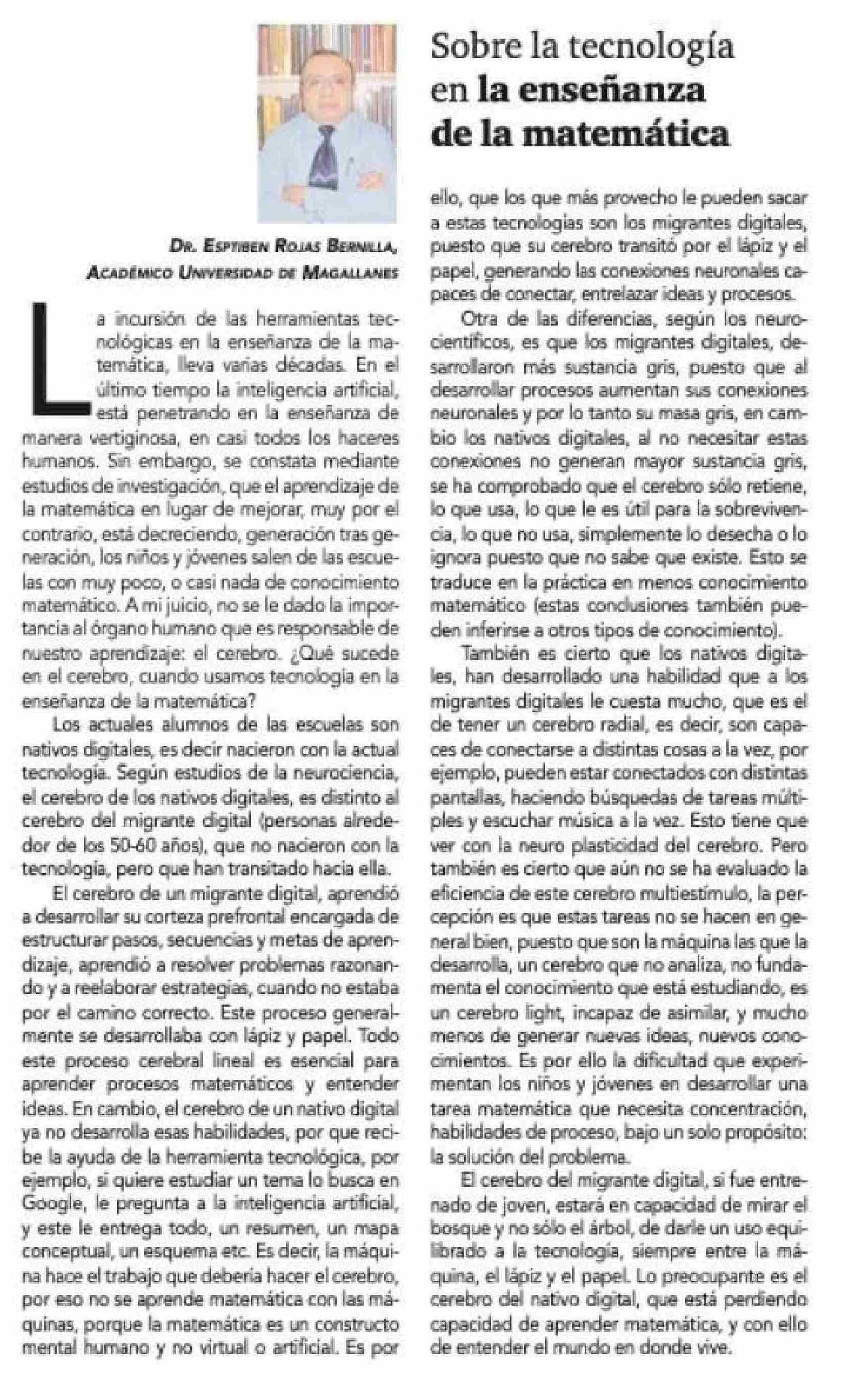 COLUMNAS DE OPINIÓN: Sobre la tecnología en la enseñanza de la matemática 31-05-2025 La Prensa Austral |