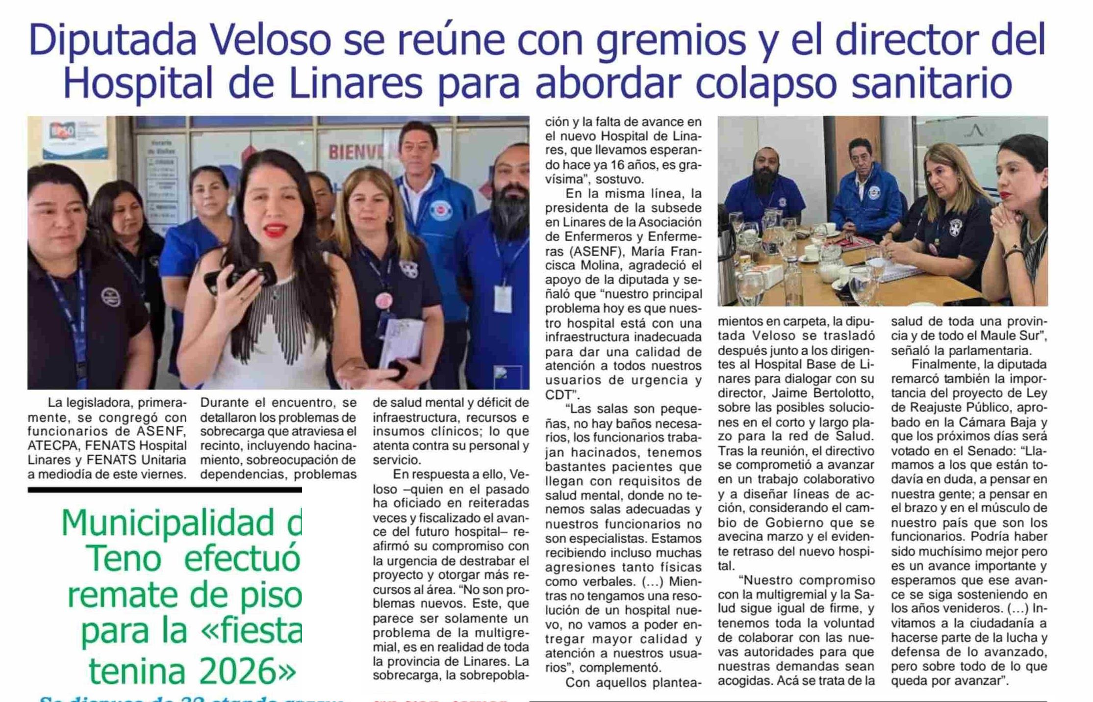 | Título: | Veloso se reúne con gremios y el director del Hospital de Linares para abordar colapso sanitario |