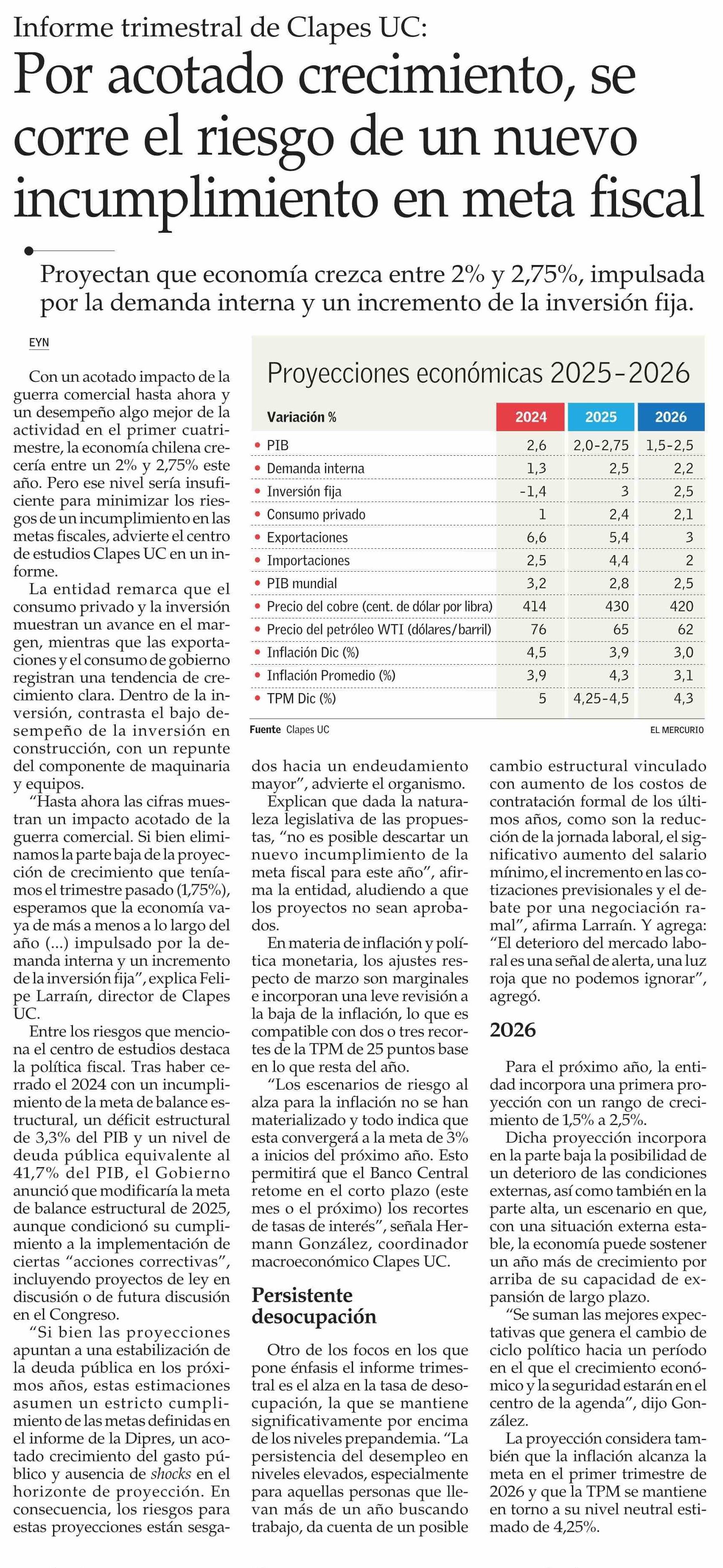Por acotado crecimiento, se corre el riesgo de un nuevo incumplimiento en meta fiscal 17-06-2025 El Mercurio |