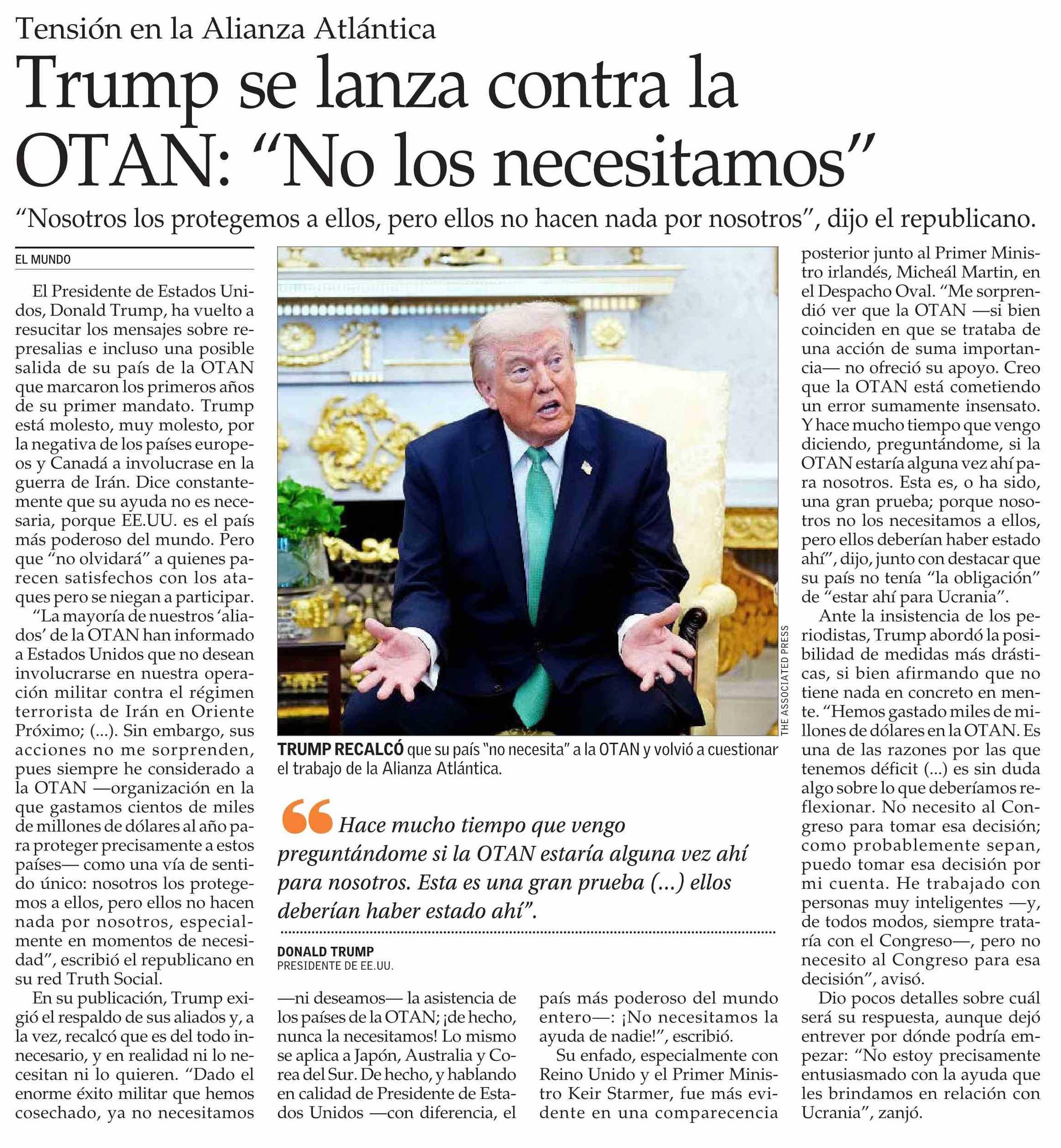 | Título: | Trump se lanza contra la OTAN: “No los necesitamos” |
