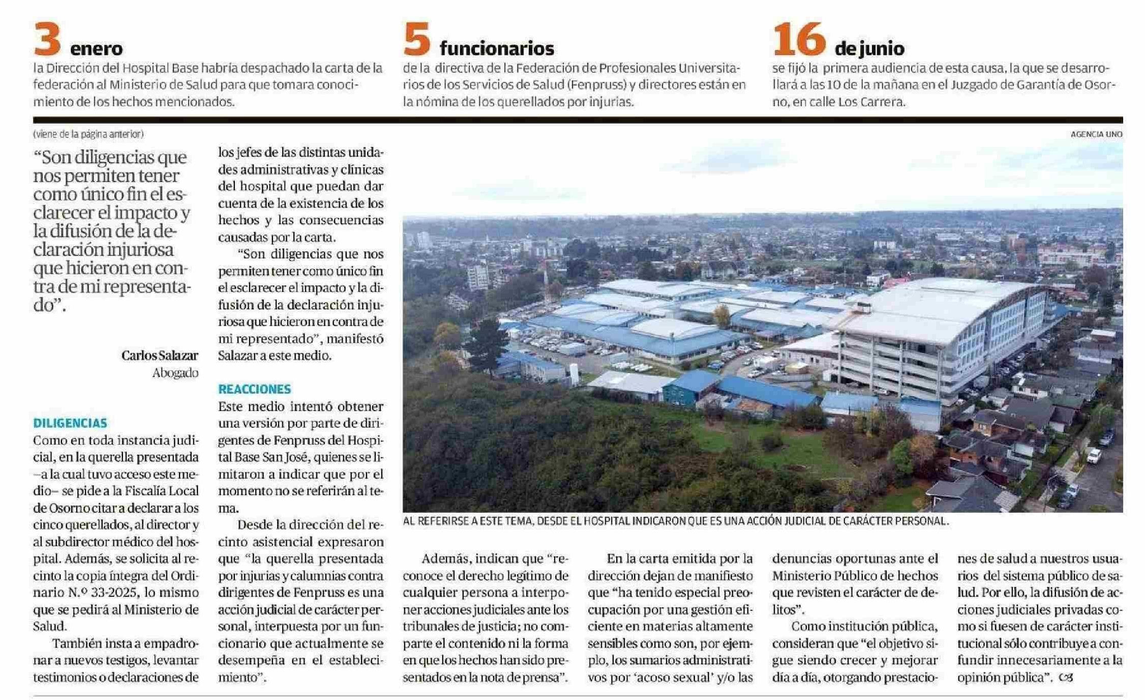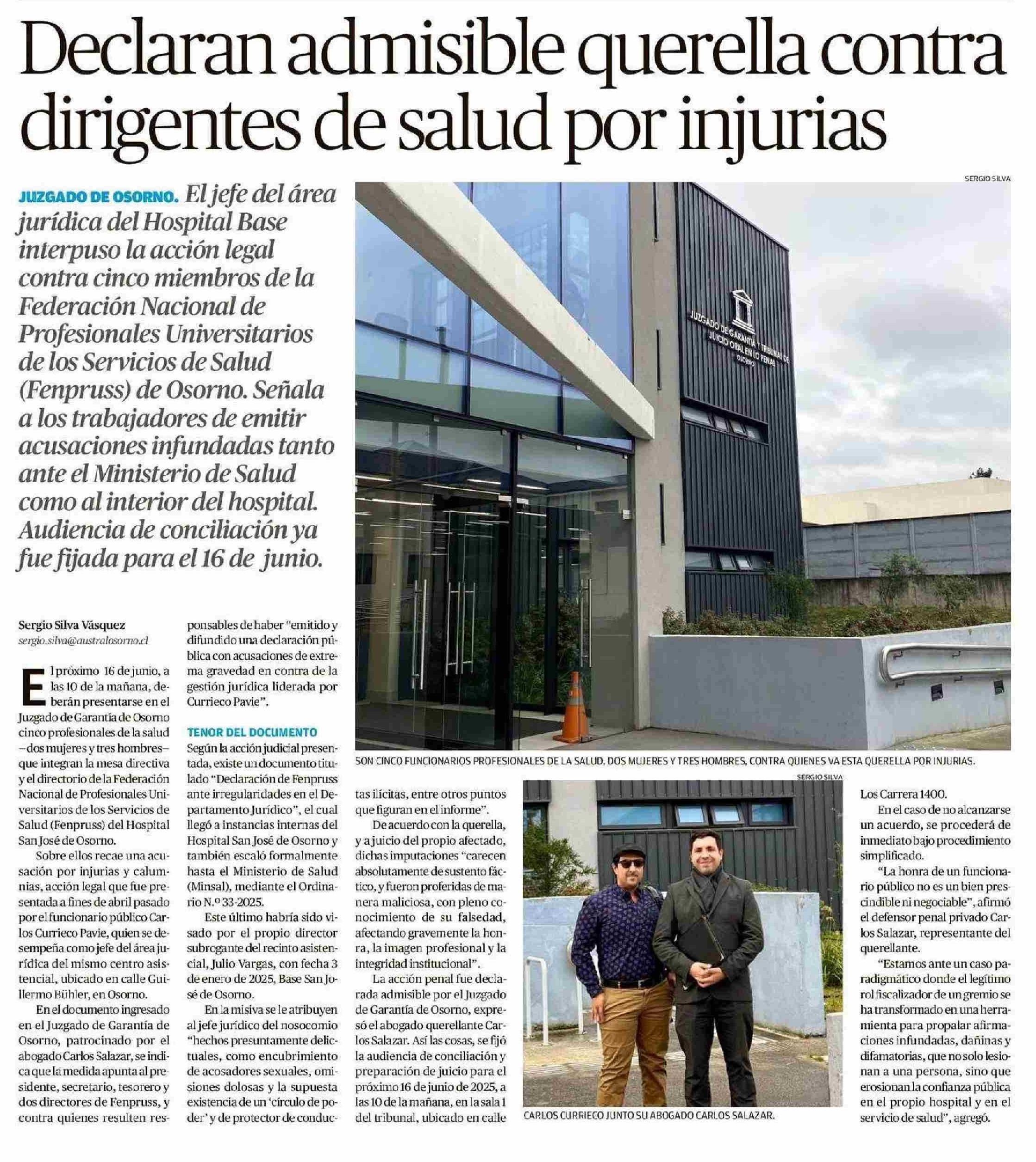Declaran admisible querella contra dirigentes de salud por injurias 15-05-2025 El Austral de Osorno |