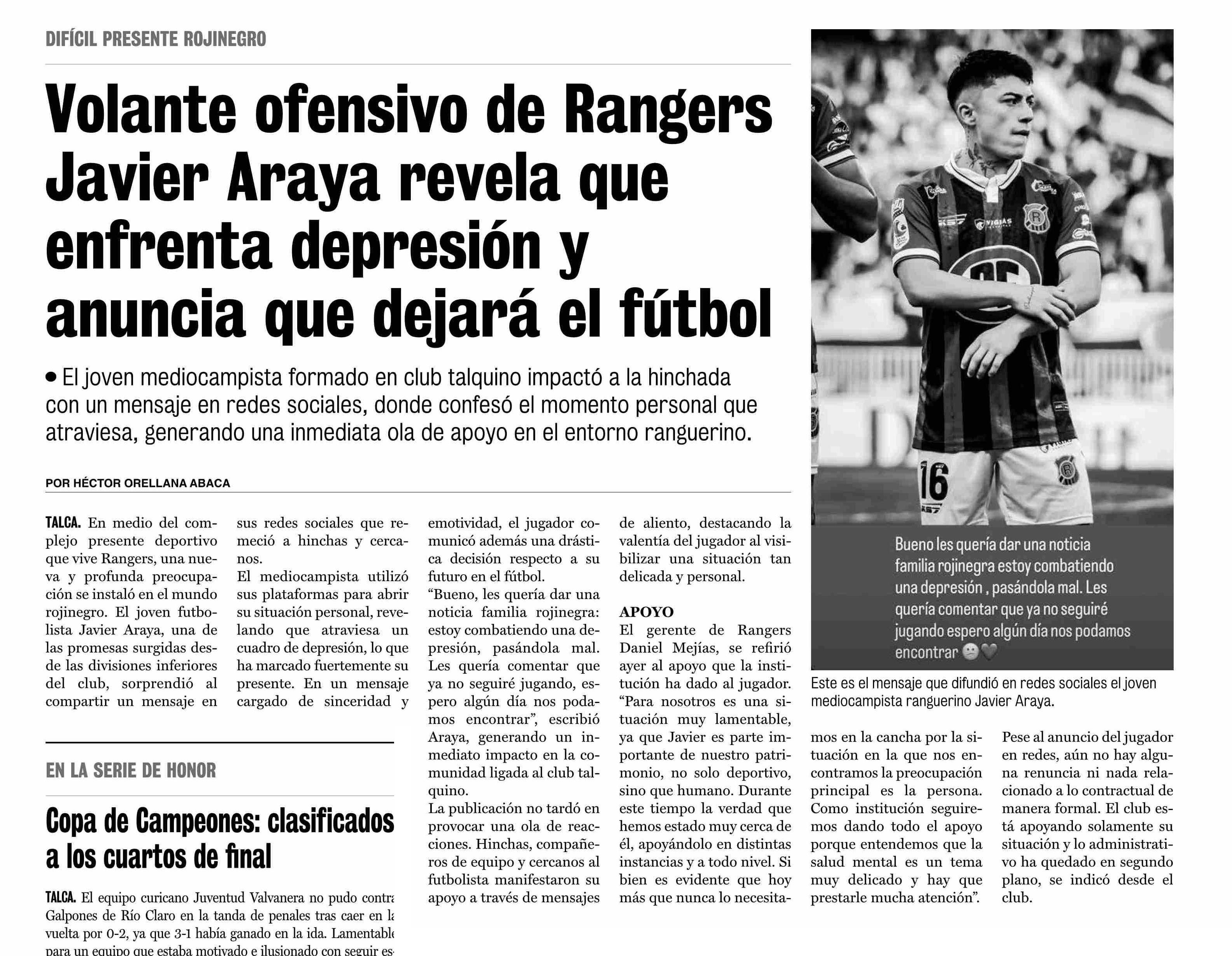 Título: Volante ofensivo de Rangers Javier Araya revela que enfrenta depresión y anuncia que dejará el fútbol