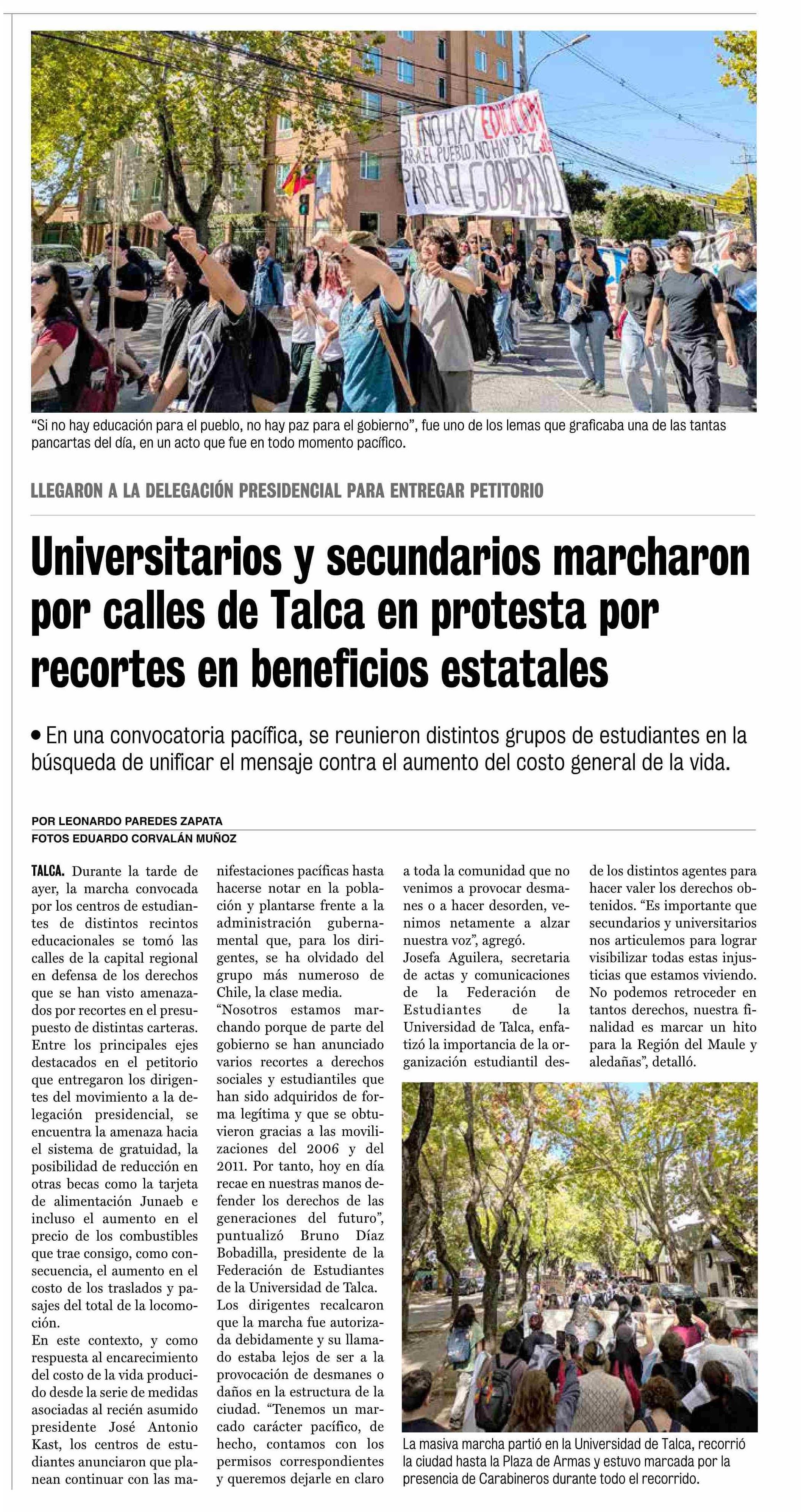 | Título: | Universitarios y secundarios marcharon por calles de Talca en protesta por recortes en beneficios estatales |