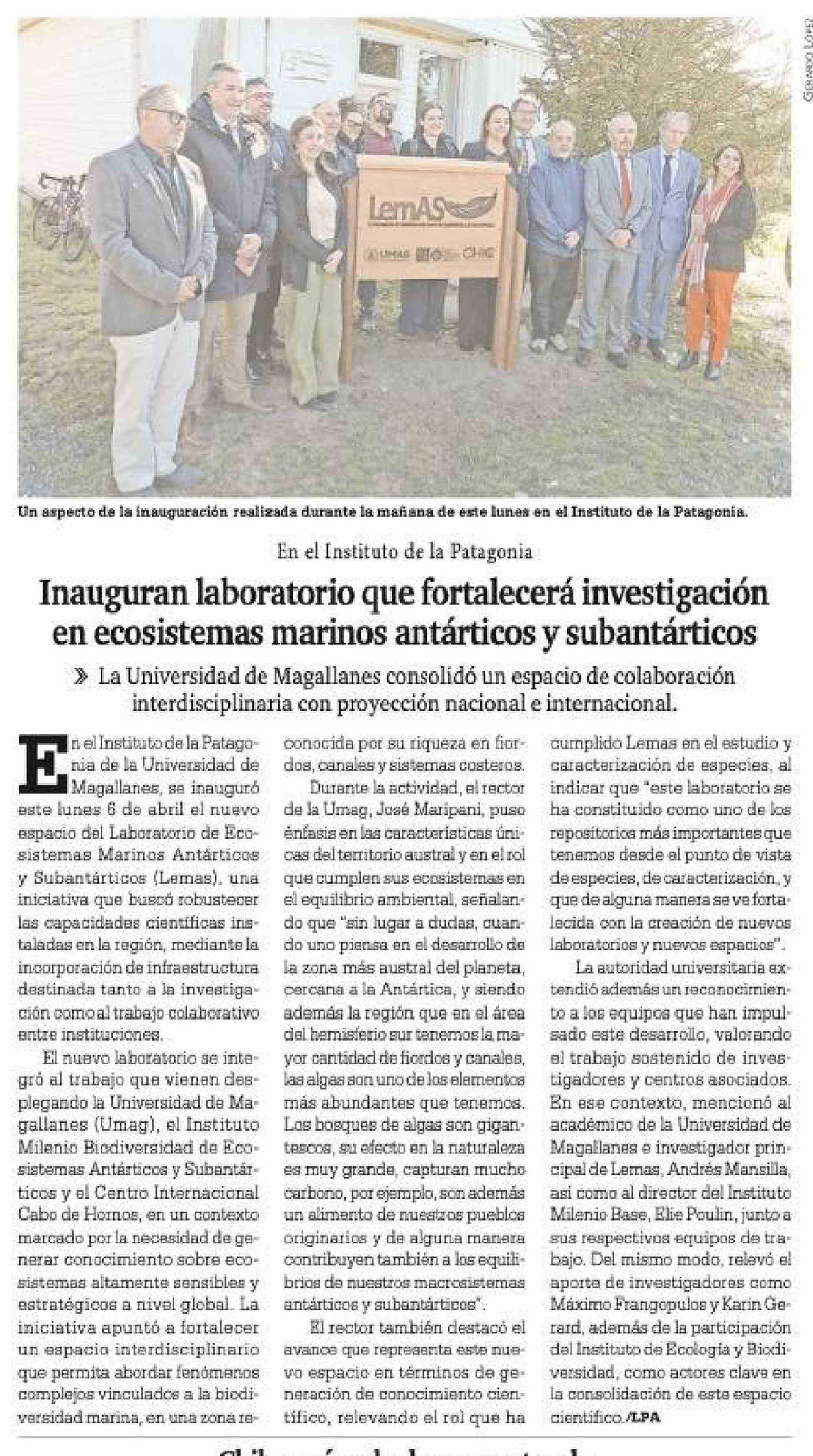 Inauguran laboratorio que fortalecerá investigación en ecosistemas marinos antárticos y subantárticos 08-04-2026 La Prensa Austral |