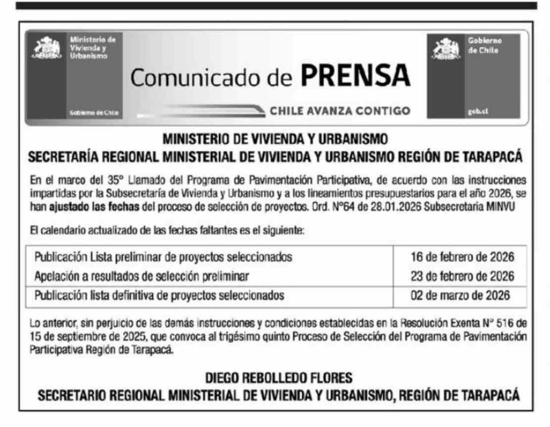 | Título: | Extractos: MINISTERIO DE VIVIENDA Y URBANISMO SECRETARÍA REGIONAL MINISTERIAL DE VIVIENDA Y URBANISMO REGIÓN DE TARAPACÁ En el marco del 35° Llamado del Programa de Pavimentación Participativa, de acuerdo con las instrucciones impartidas por la Subsecretaría de Vivienda y Urbanismo y a los lineamien |
