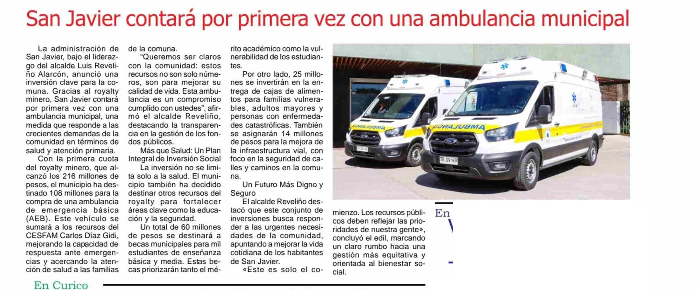 San Javier contará por primera vez con una ambulancia municipal 23-04-2026 Maule Hoy |
