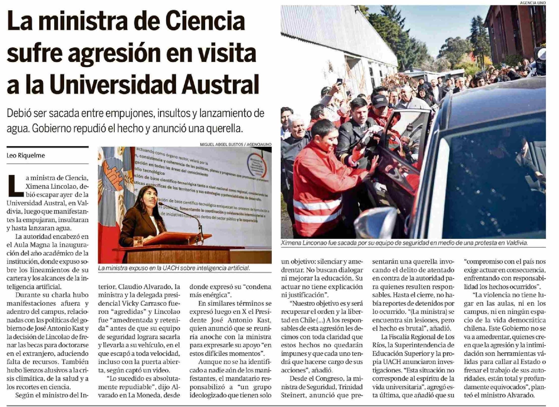 | Título: | La ministra de Ciencia sufre agresión en visita a la Universidad Austral |