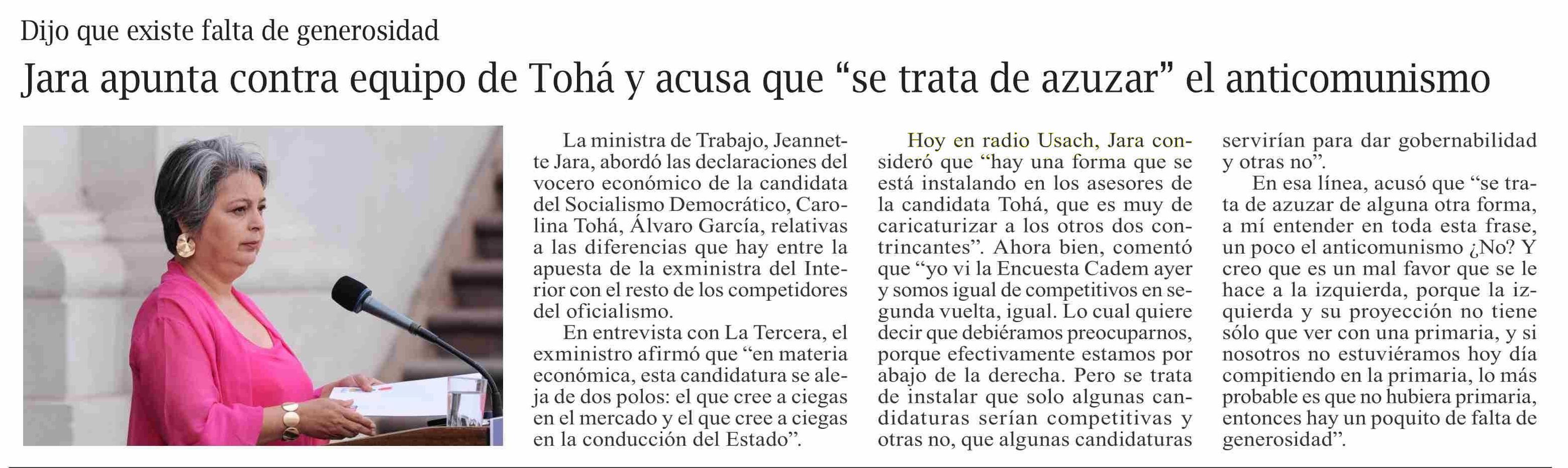 | Título: | Jara apunta contra equipo de Tohá y acusa que “se trata de azuzar” el anticomunismo |