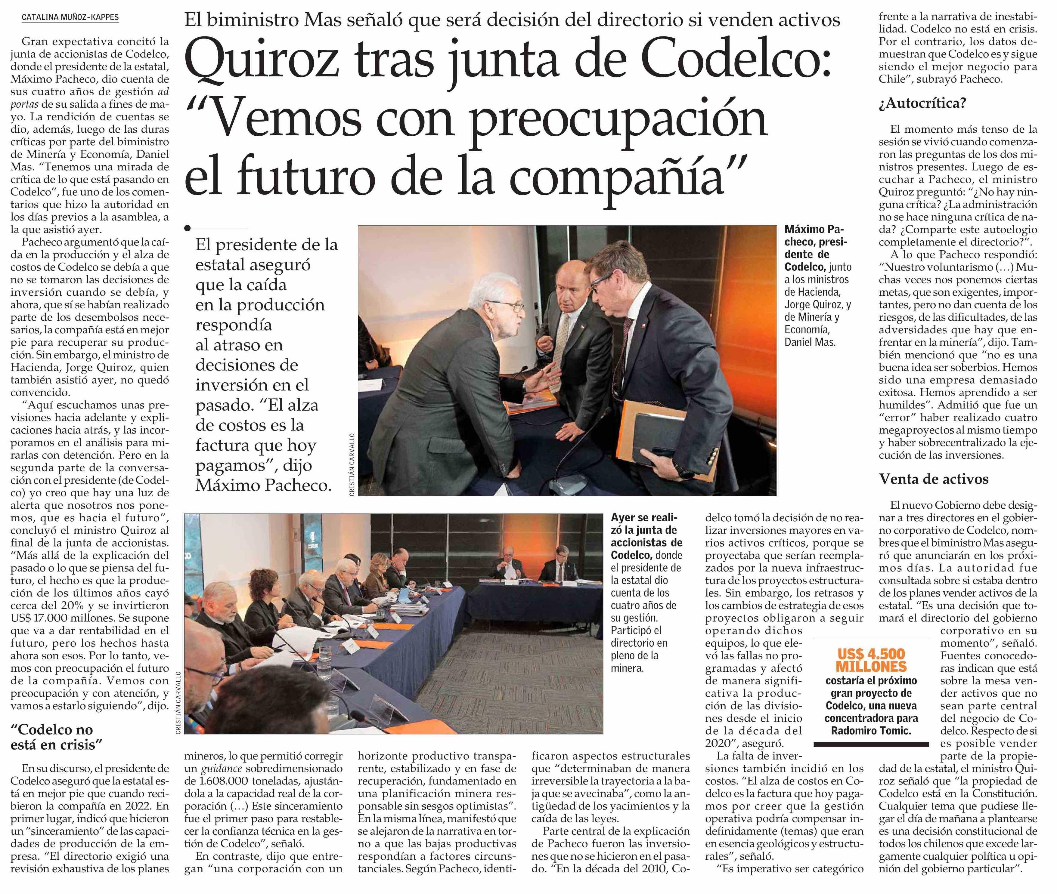 Título: Quiroz tras junta de Codelco: “Vemos con preocupación el futuro de la compañía”