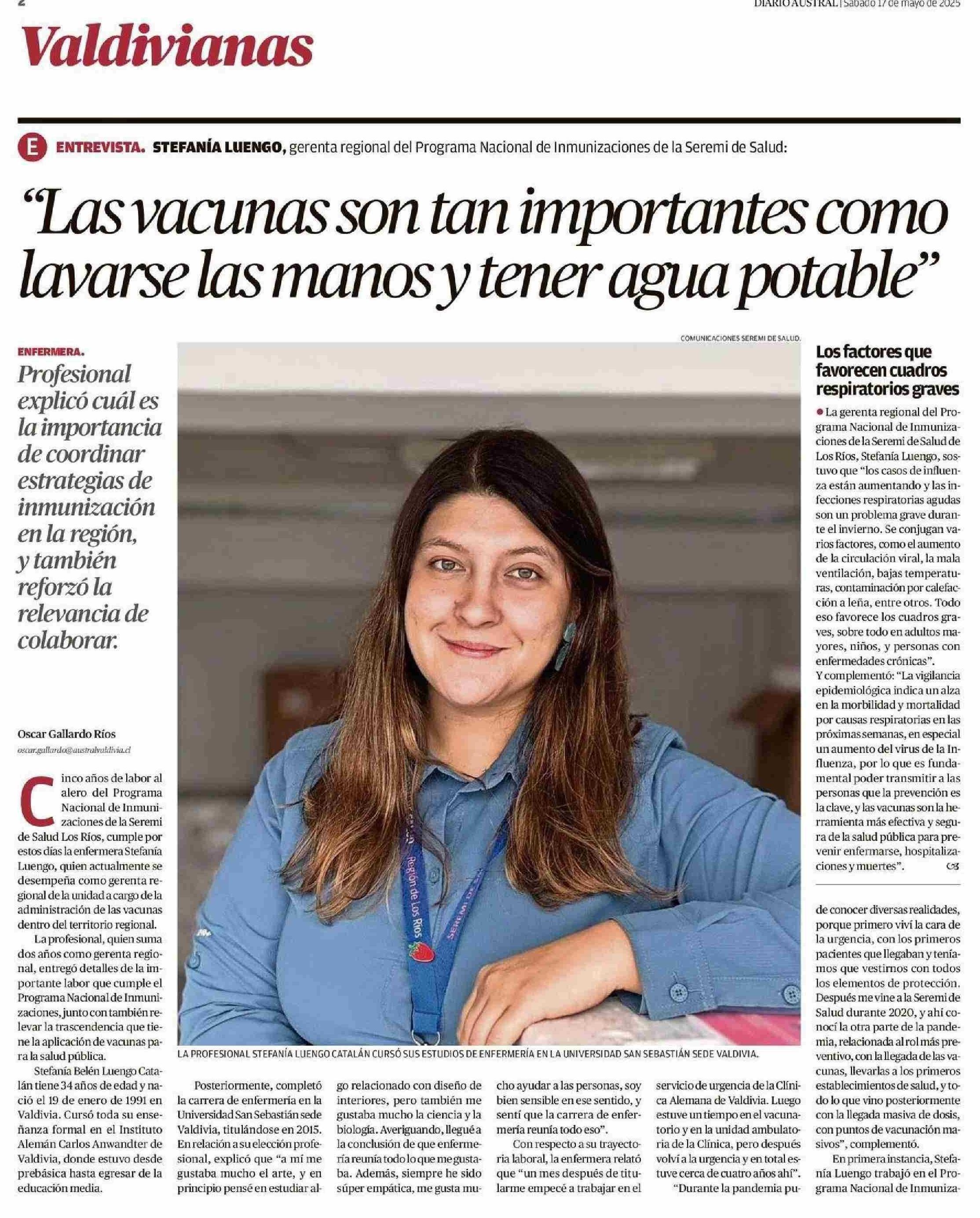 “Las vacunas son tan importantes como lavarse las manos y tener agua potable” 17-05-2025 Diario Austral Región de Los Ríos |