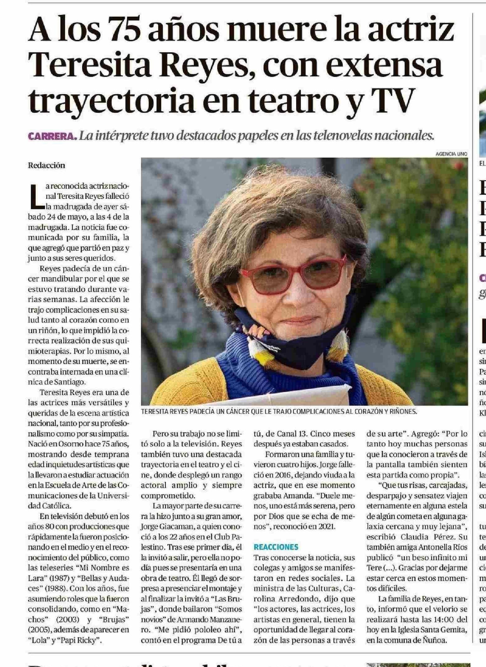 | Título: | A los 75 años muere la actriz Teresita Reyes, con extensa trayectoria en teatro y TV |