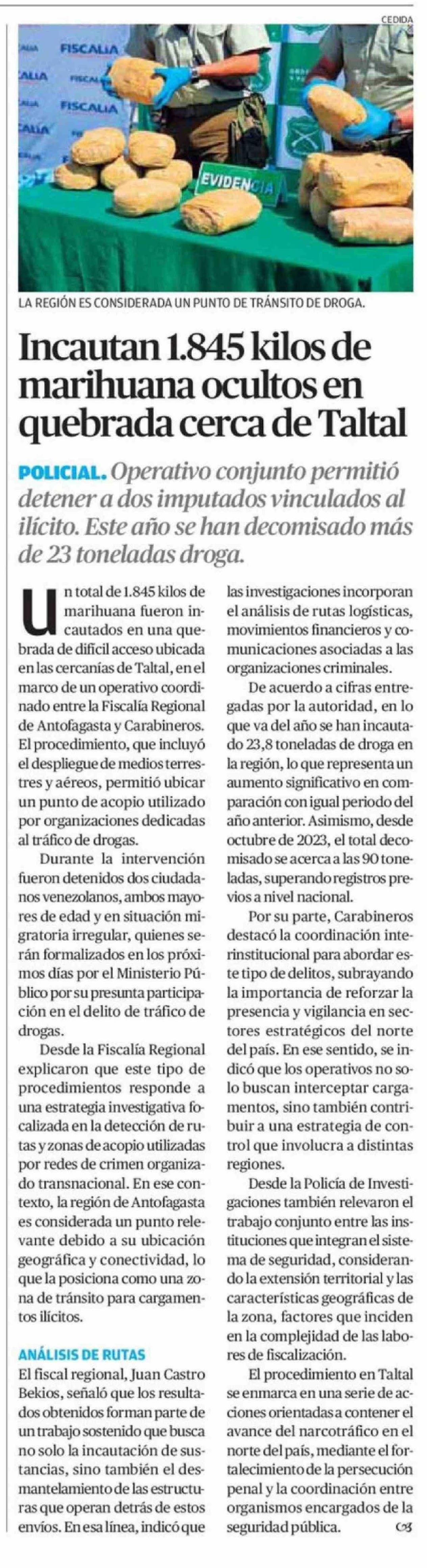Incautan 1.845 kilos de marihuana ocultos en quebrada cerca de Taltal 25-04-2026 El Mercurio de Calama |