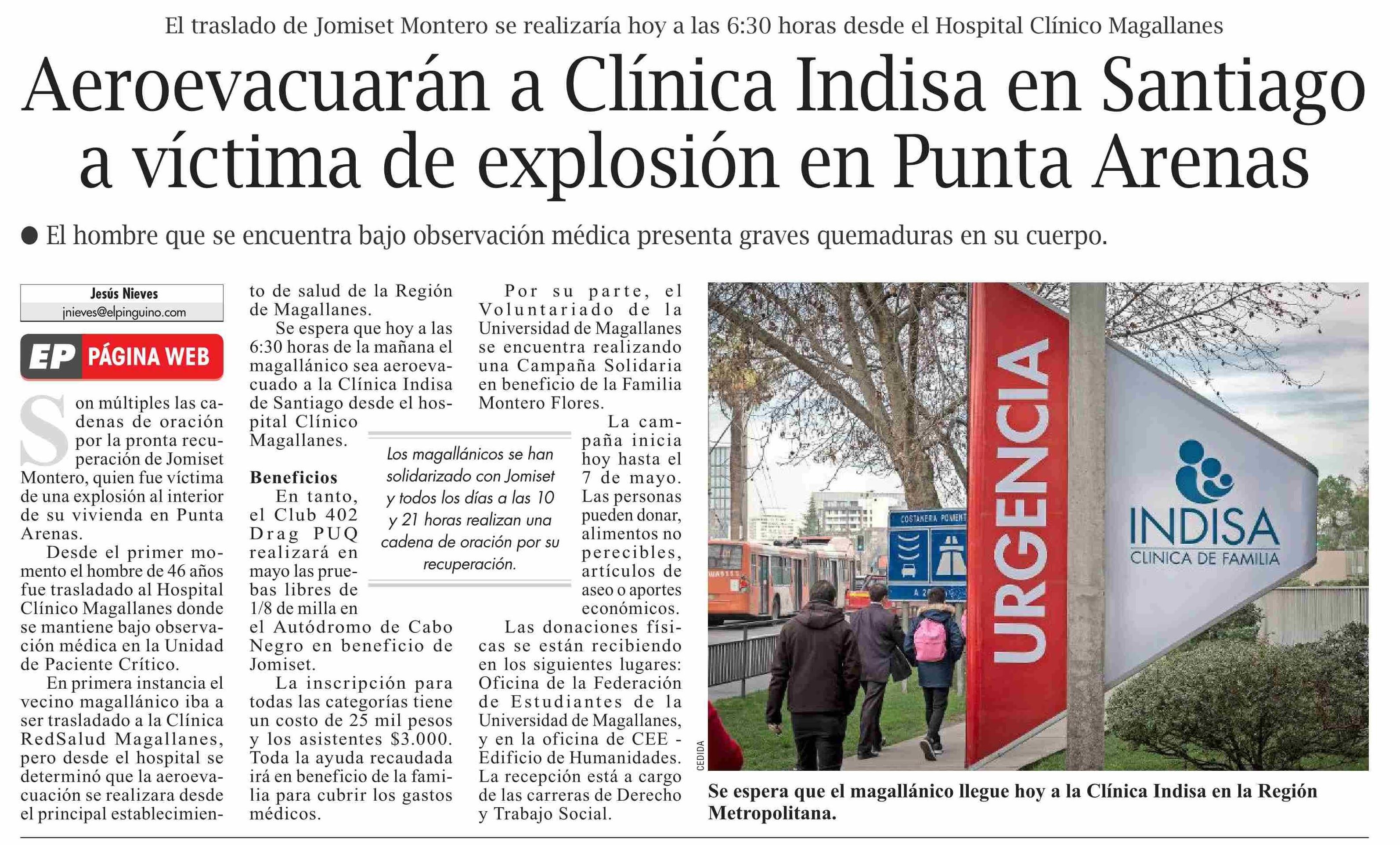 Aeroevacuarán a Clínica Indisa en Santiago a víctima de explosión en Punta Arenas 23-04-2026 El Pingüino |