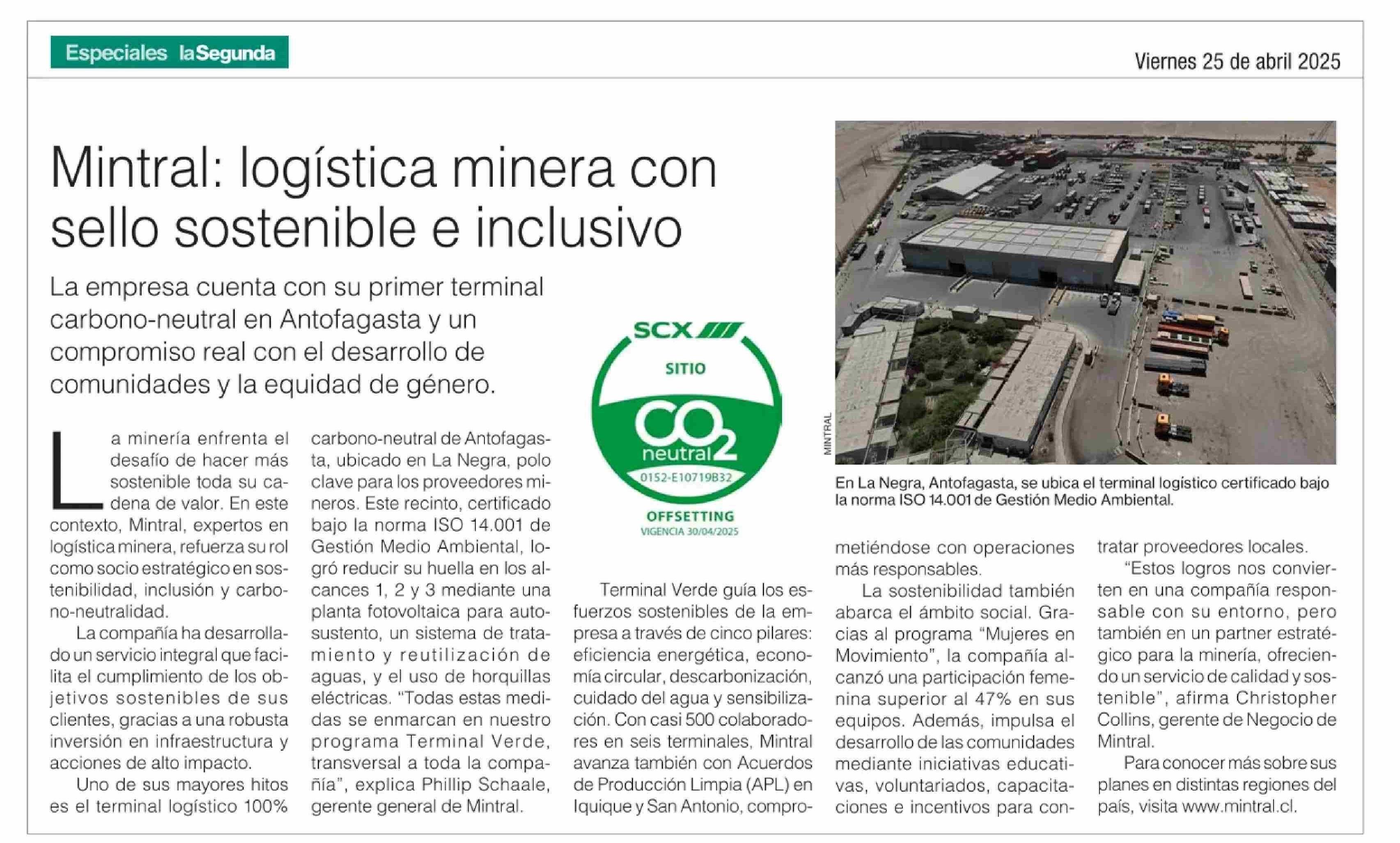Mintral: logística minera con sello sostenible e inclusivo 25-04-2025 La Segunda |