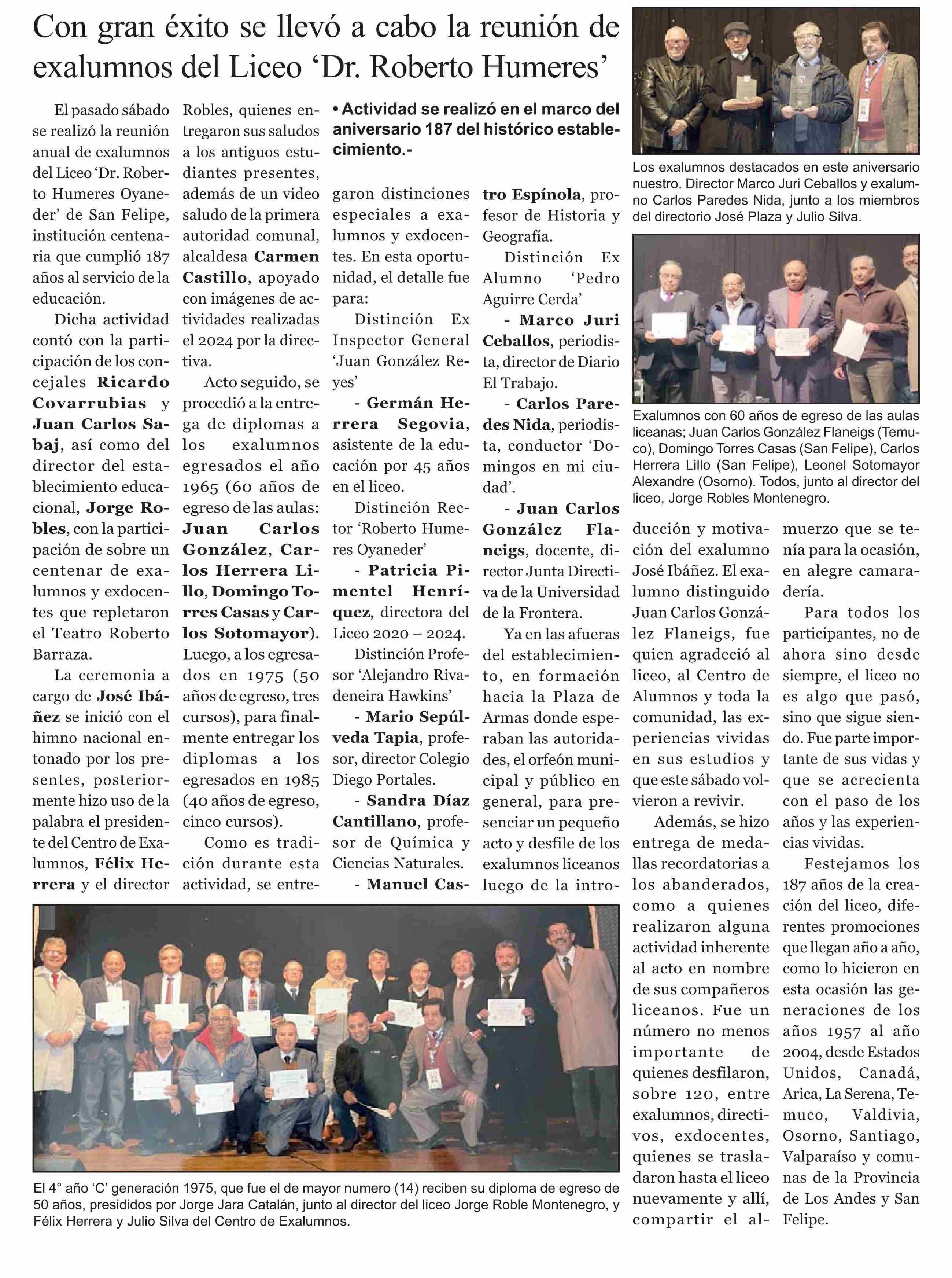 Con gran éxito se llevó a cabo la reunión de exalumnos del Liceo “Dr. Roberto Humeres” 13-06-2025 El Trabajo |