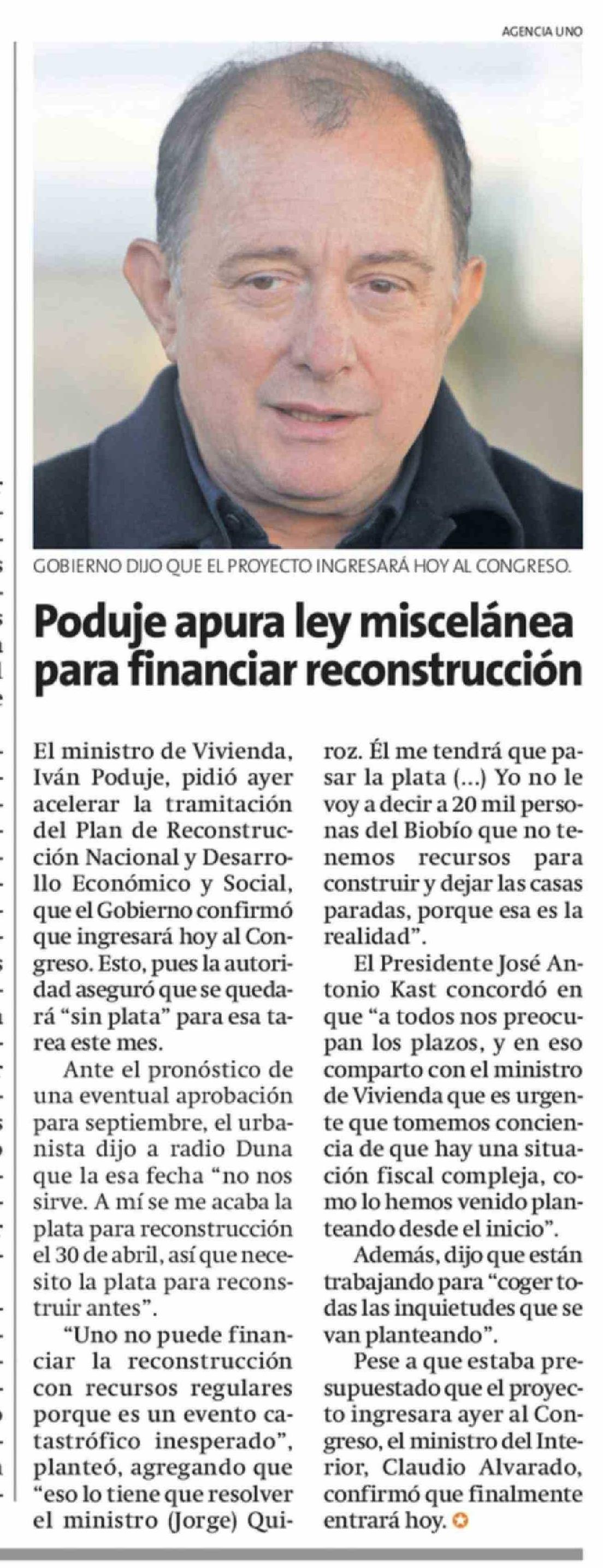 Título: Poduje apura ley miscelánea para financiar reconstrucción