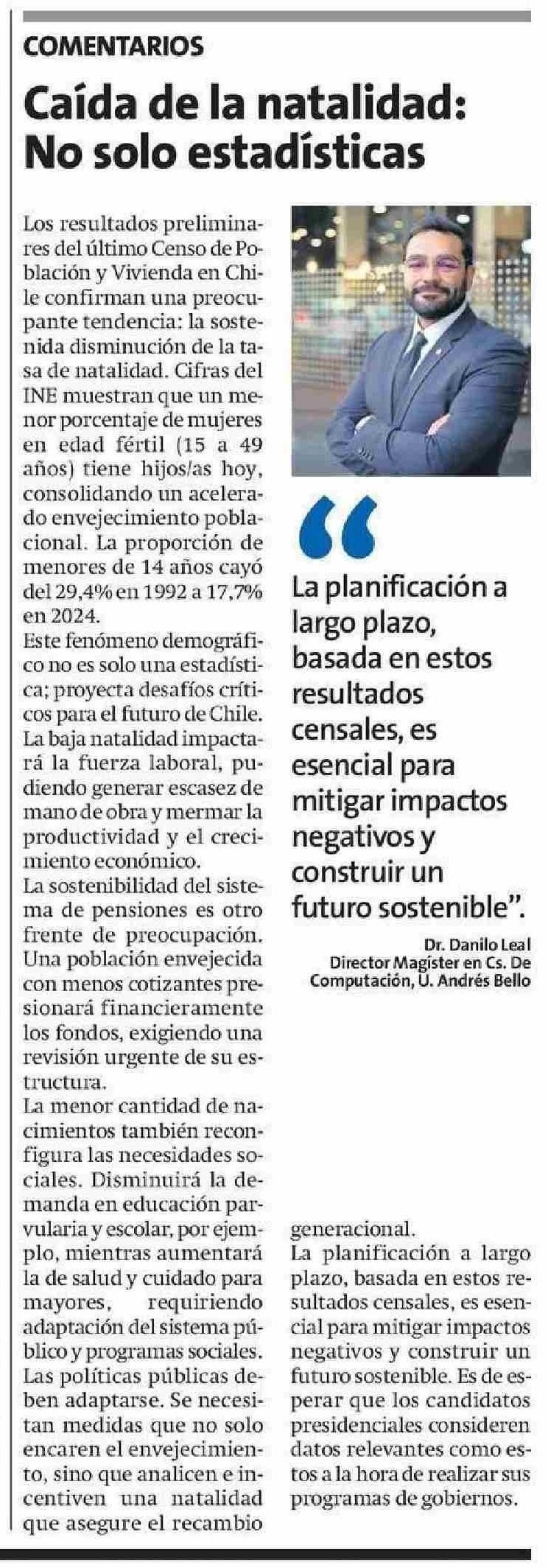 Columnas de Opinión: Caída de la natalidad: No solo estadísticas 16-05-2025 La Estrella de Arica |