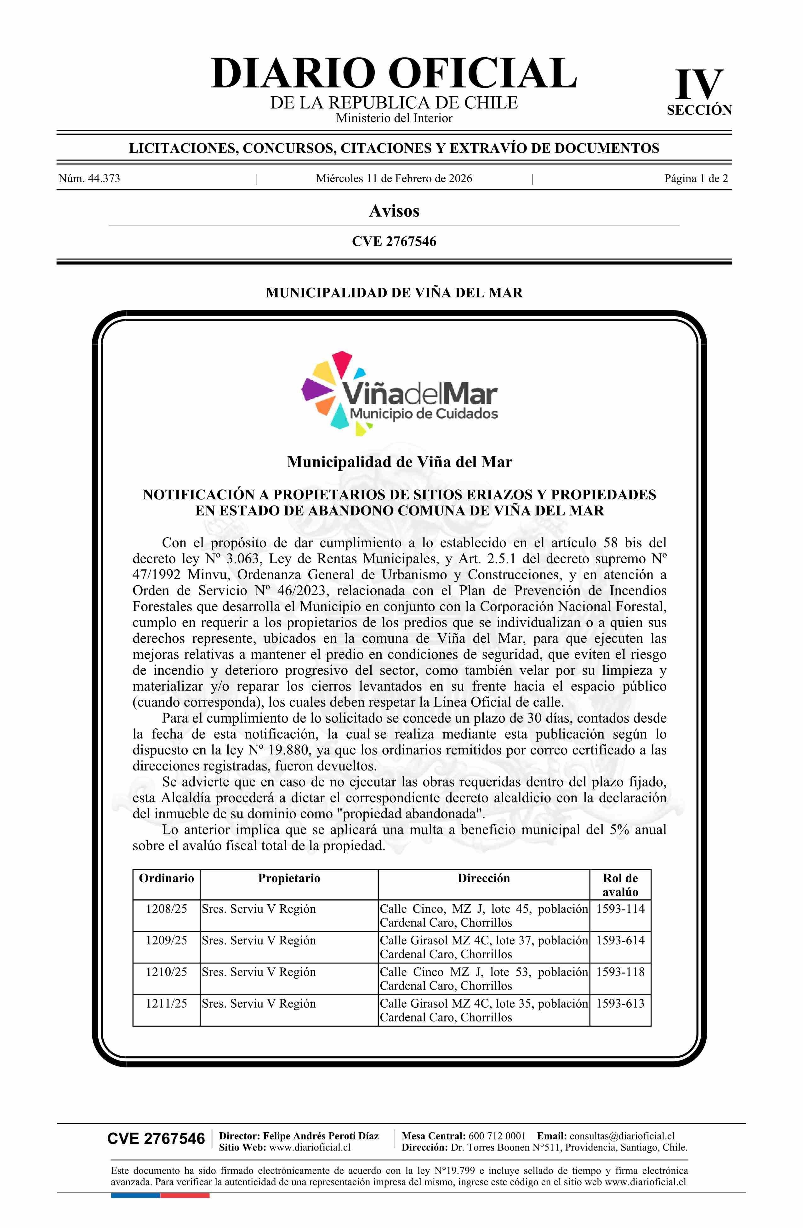 AVISO LICITACIONES: Notifica a propietarios de sitios eriazos y propiedades en estado de abandono lo que indica 11-02-2026 Diario Oficial Edición Electrónica |