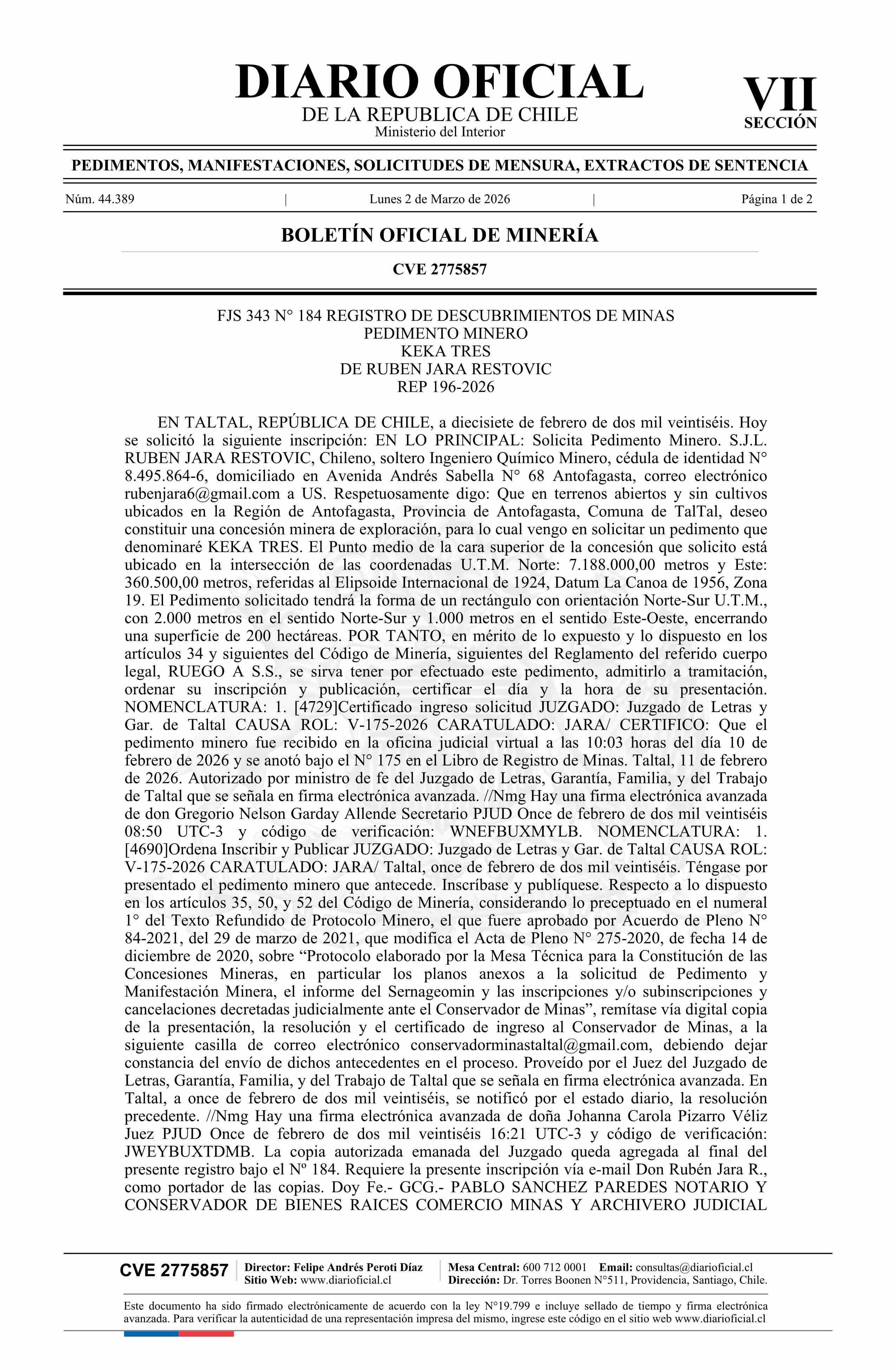 02-03-2026 DIARIO OFICIAL CHILE - BOLETÍN OFICIAL DE MINERÍA
