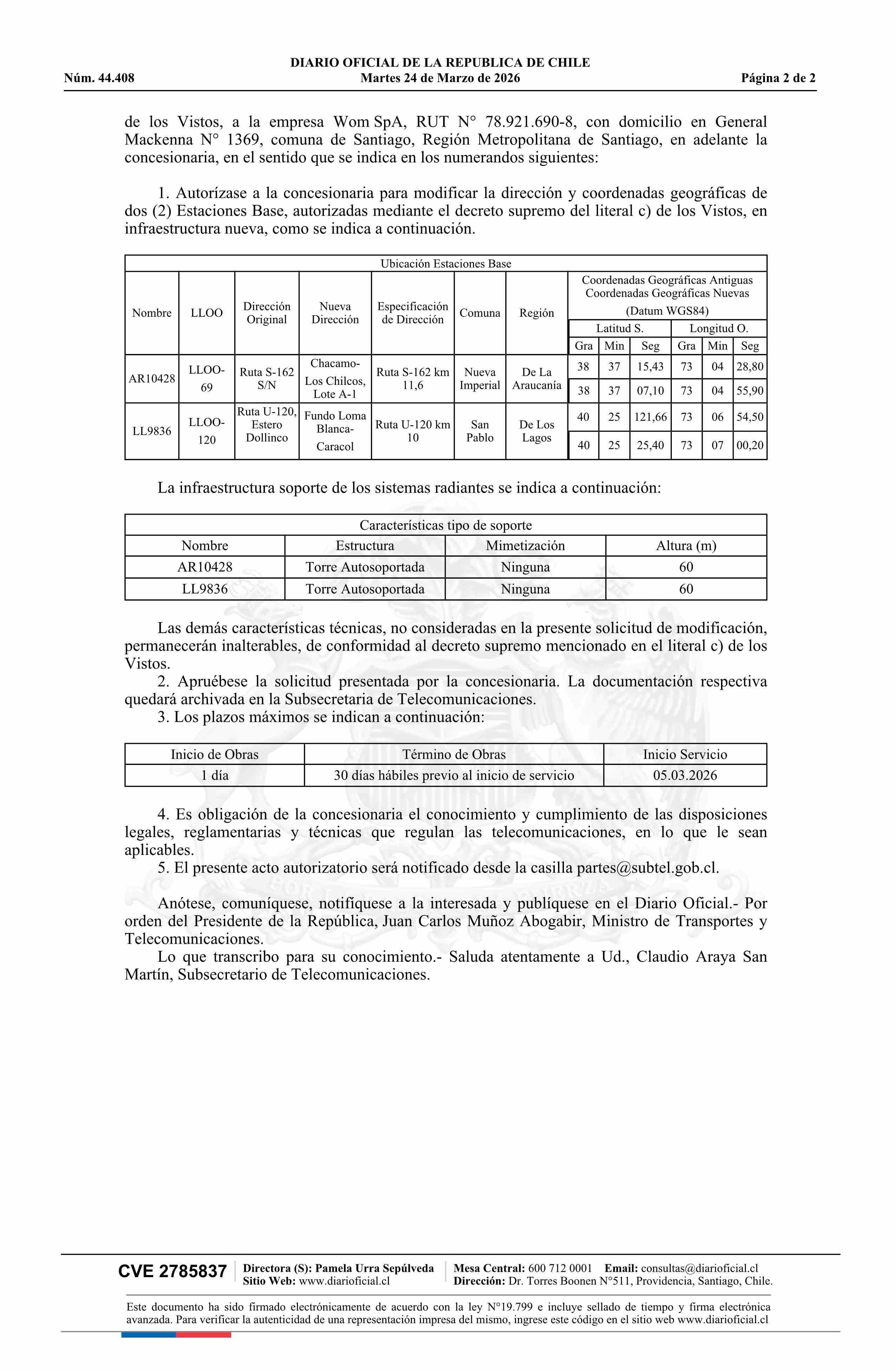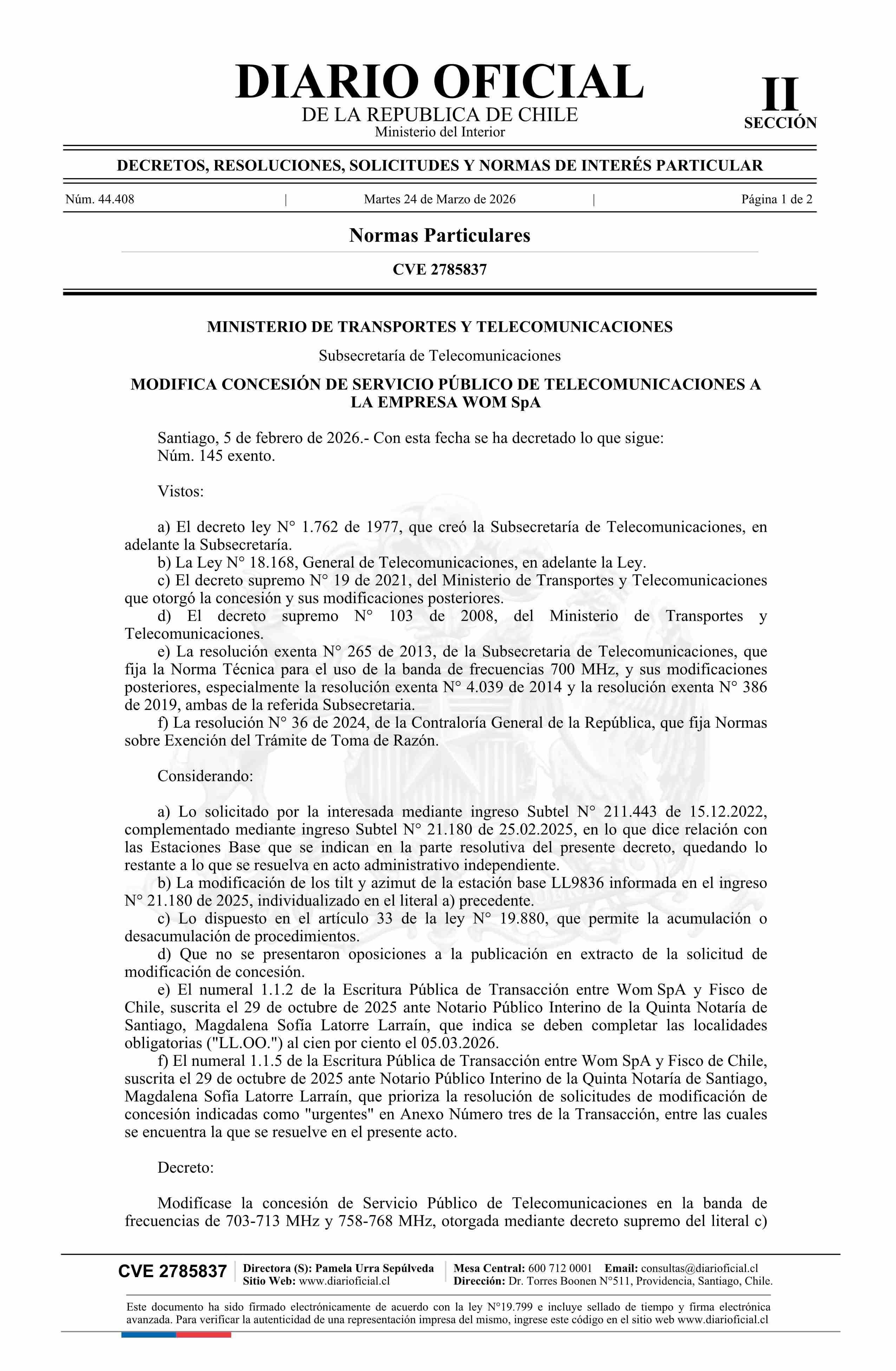 Decreto exento número 145, de 2026.- Modifica concesión de servicio público de telecomunicaciones a la empresa Wom SpA 24-03-2026 Diario Oficial Edición Electrónica |