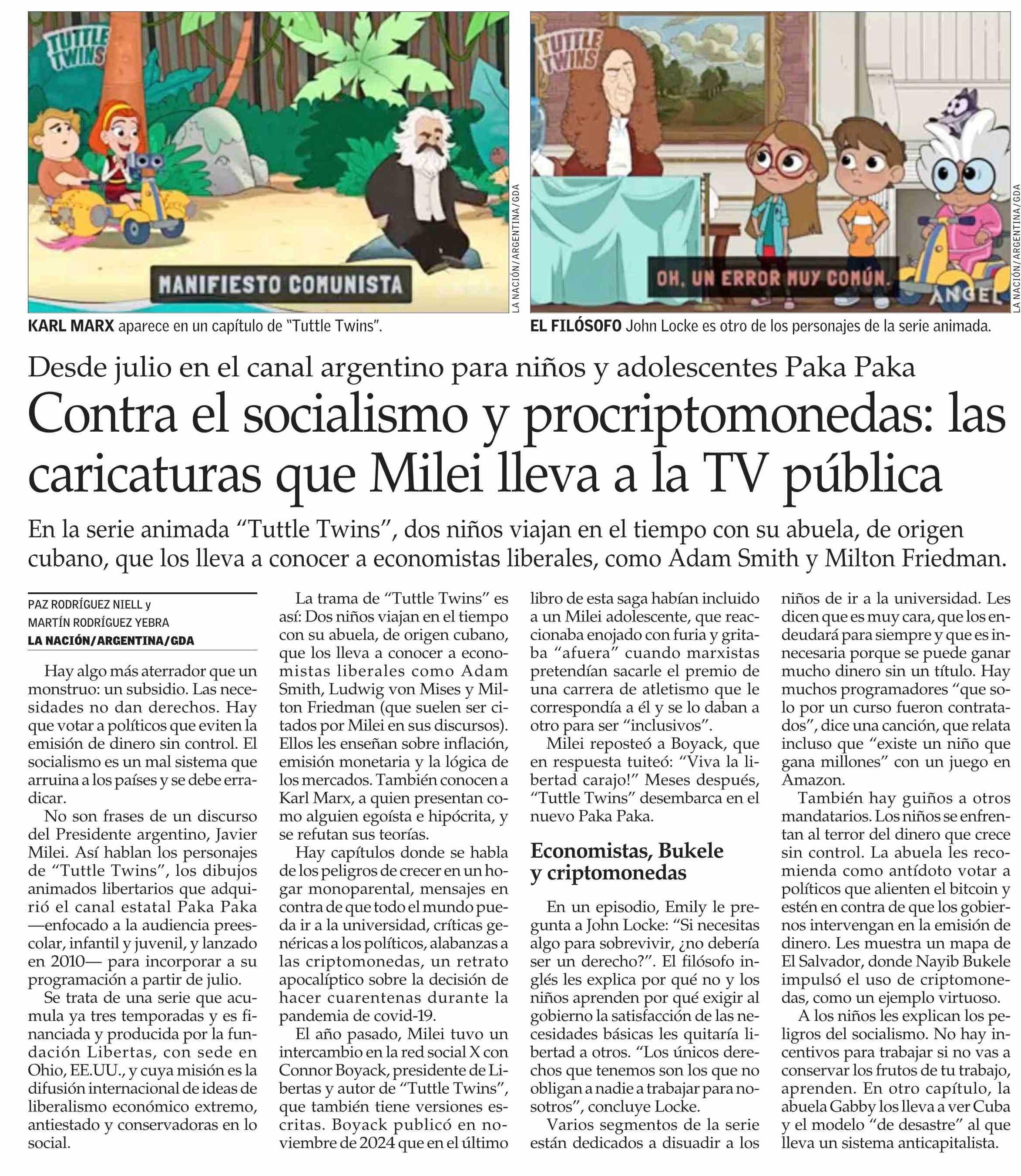 Contra el socialismo y procriptomonedas: las caricaturas que Milei lleva a la TV pública 29-05-2025 El Mercurio |