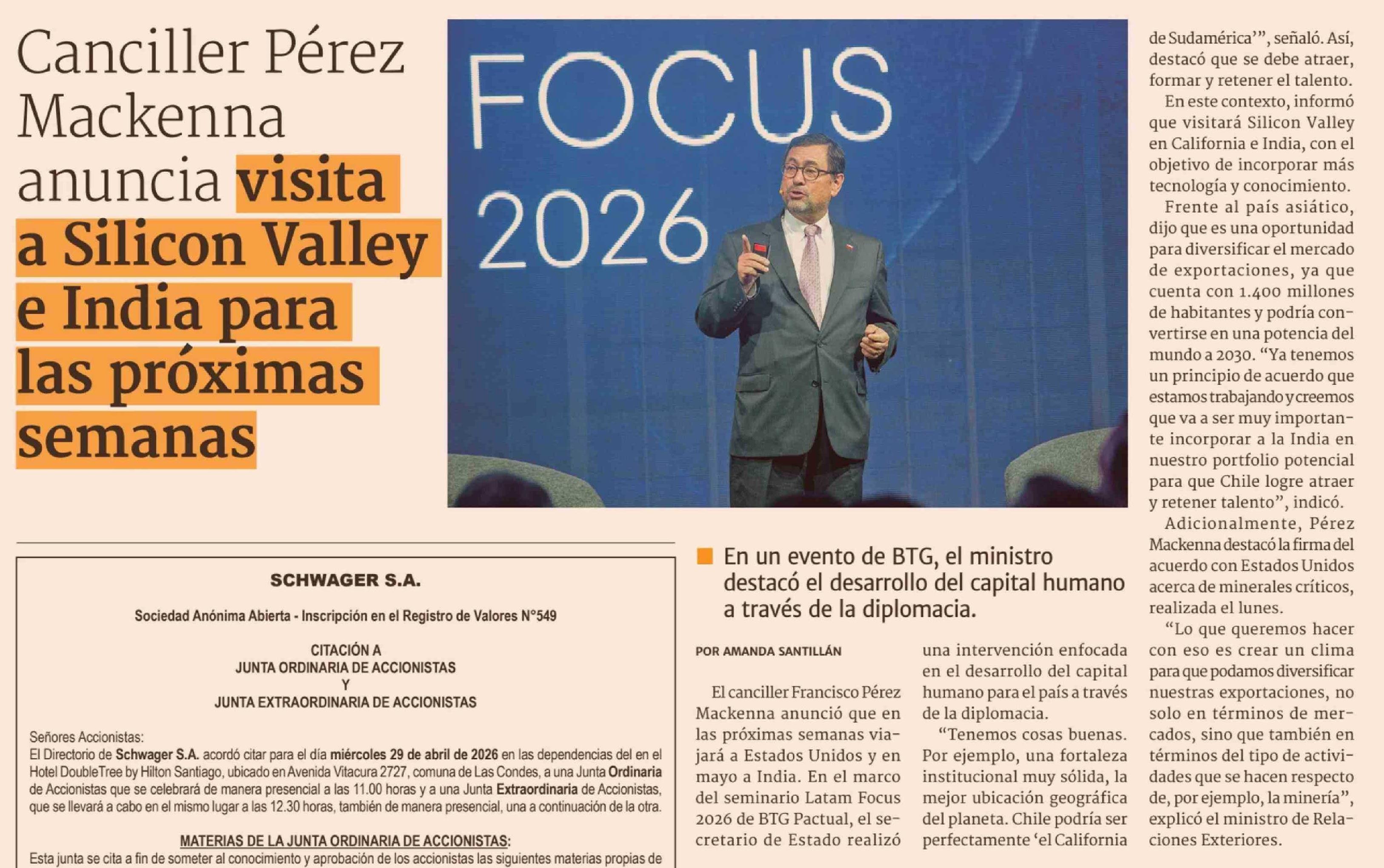 Título: Canciller Pérez Mackenna anuncia visita a Silicon Valley e India para las próximas semanas