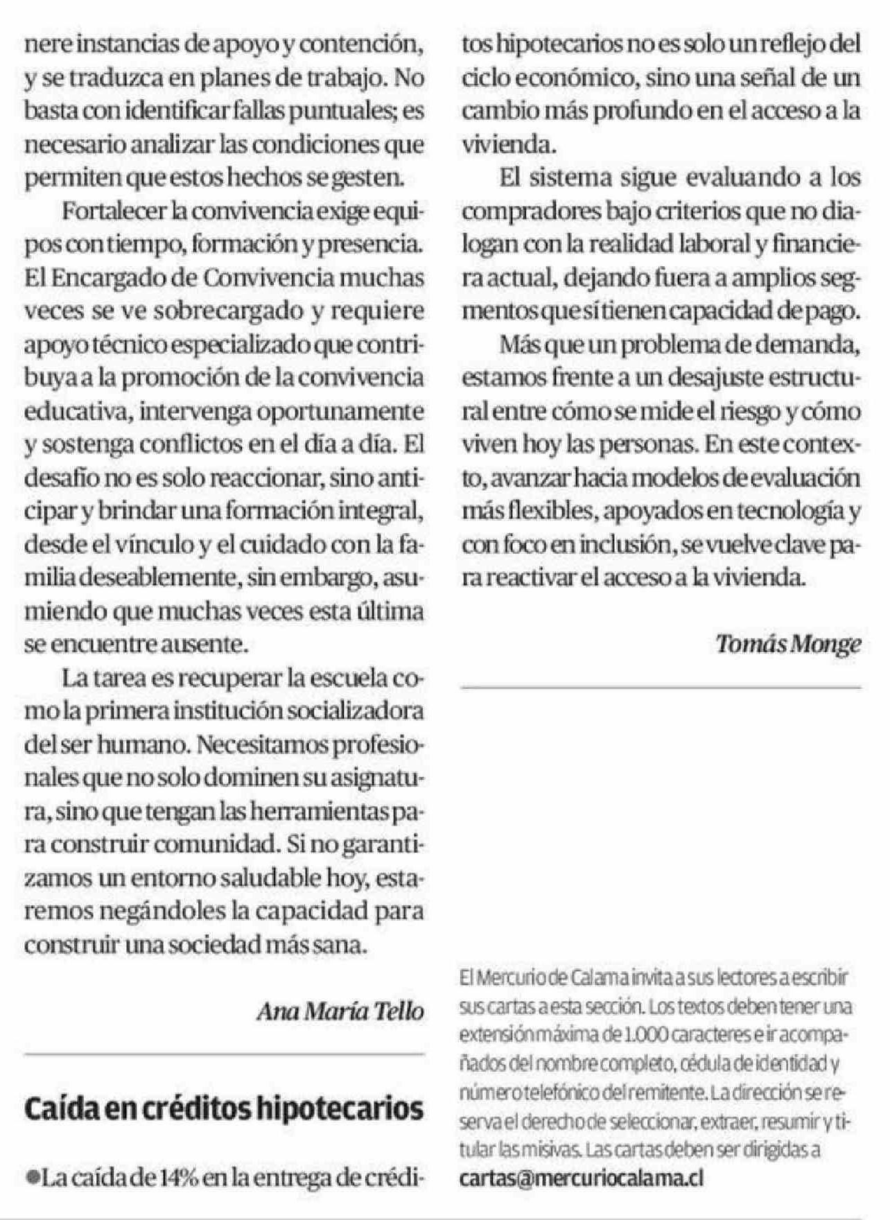 Cartas: Caída en créditos hipotecarios 22-04-2026 El Mercurio de Calama |