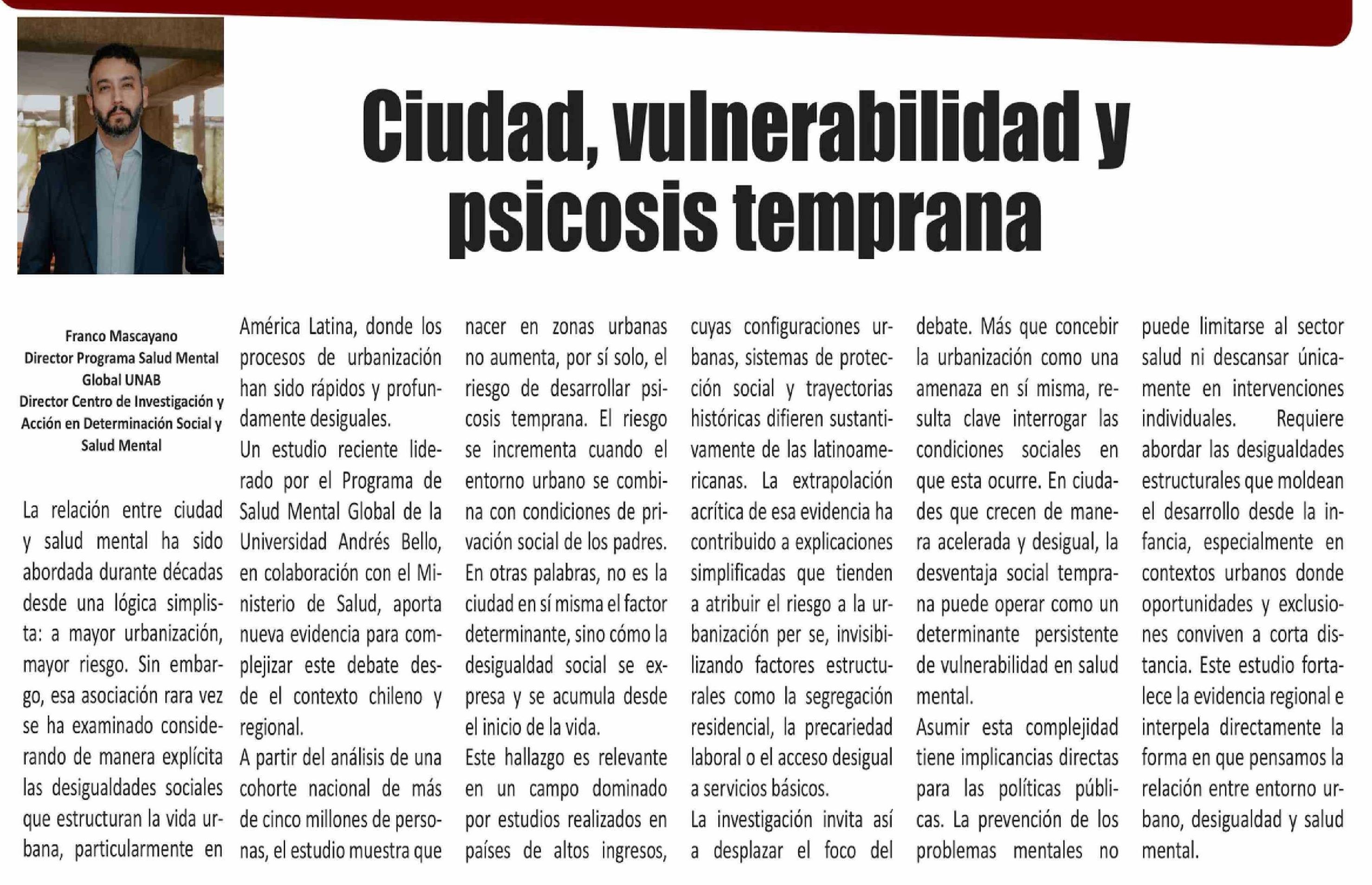 | Título: | Columnas de Opinión: Ciudad, vulnerabilidad y psicosis temprana |
