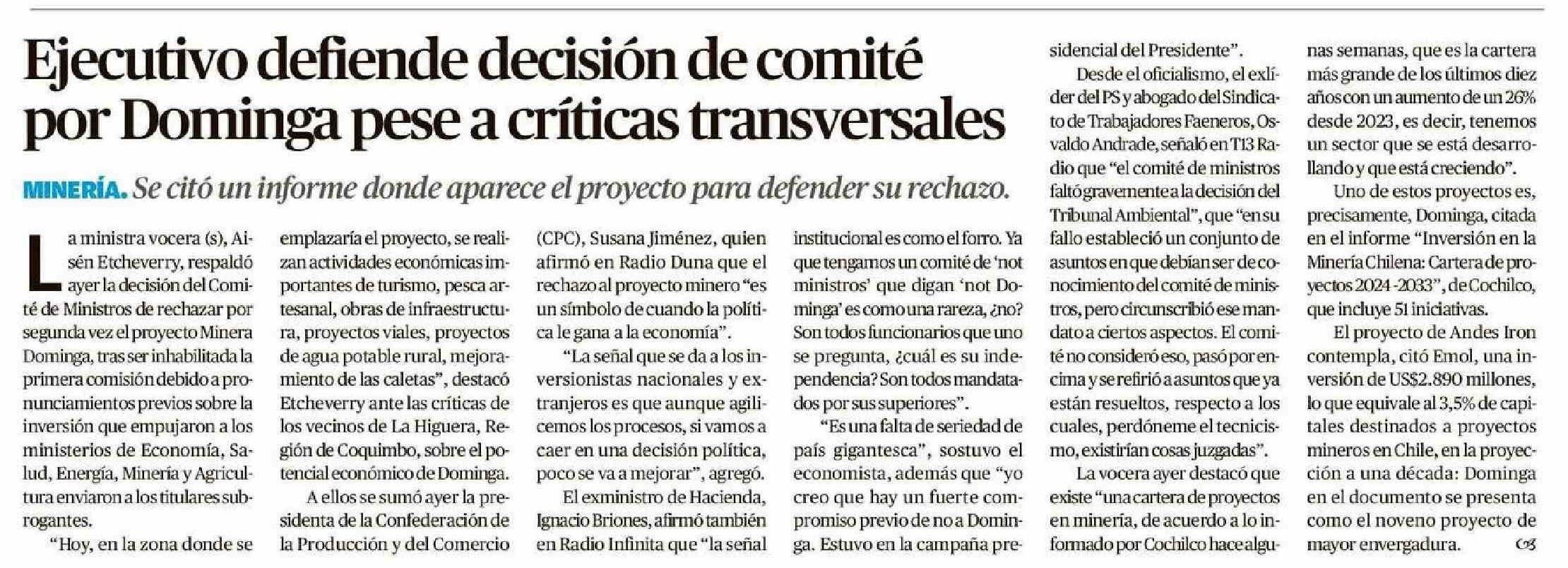 Ejecutivo defiende decisión de comité por Dominga pese a críticas transversales 10-01-2025 El Mercurio de Valparaíso |