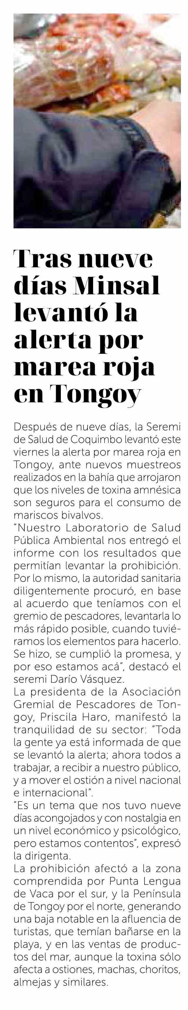 Título: Tras nueve días Minsal levantó la alerta por marea roja en Tongoy