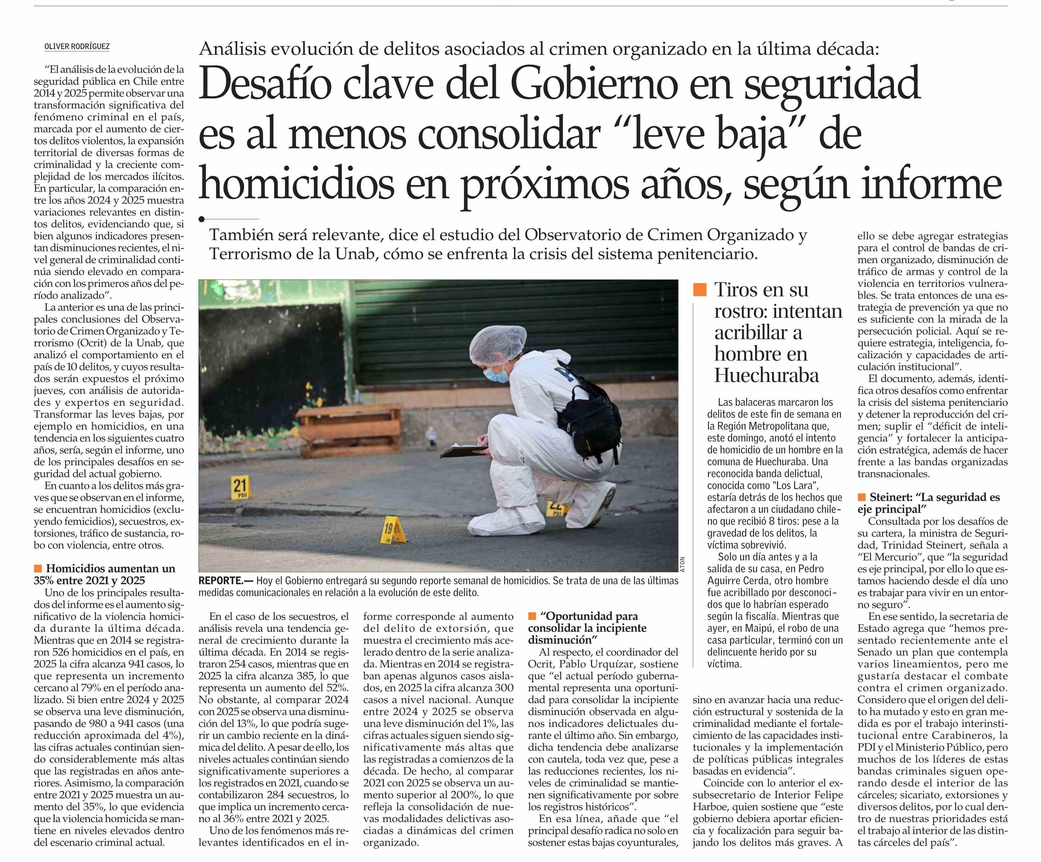 Desafío clave del Gobierno en seguridad es al menos consolidar “leve baja” de homicidios en próximos años, según informe 20-04-2026 El Mercurio |