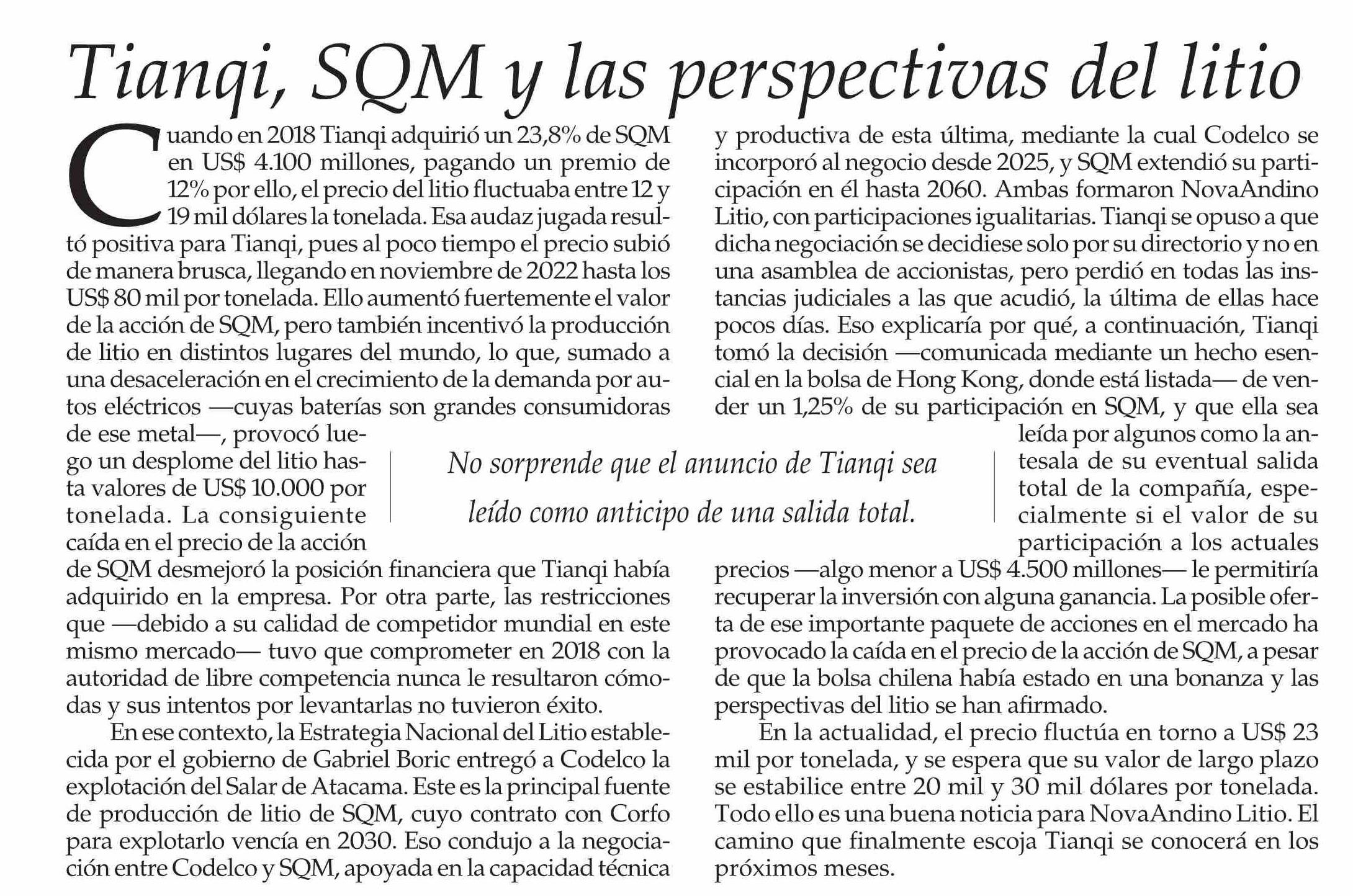 Título: EDITORIAL: Tianqi, SQM y las perspectivas del litio