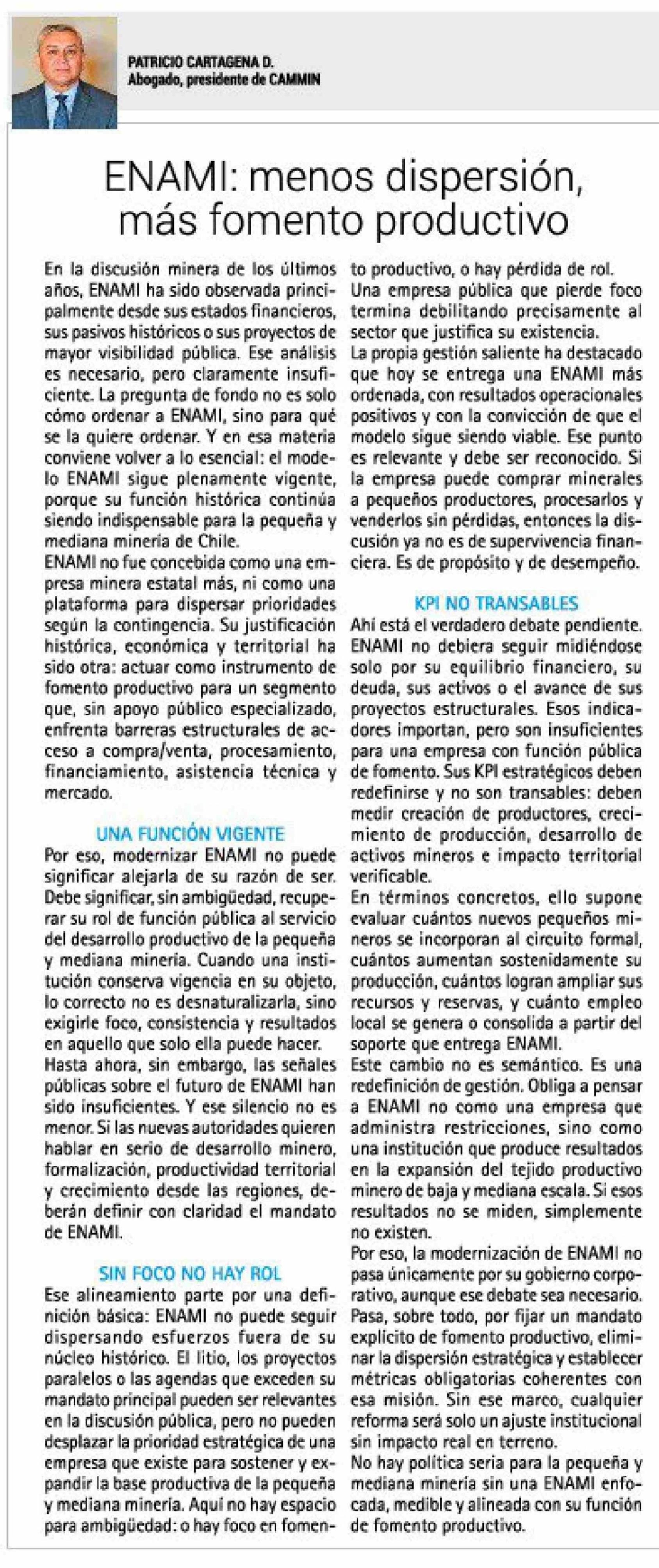 | Título: | Columnas de Opinión: ENAMI: menos dispersión, más fomento productivo |