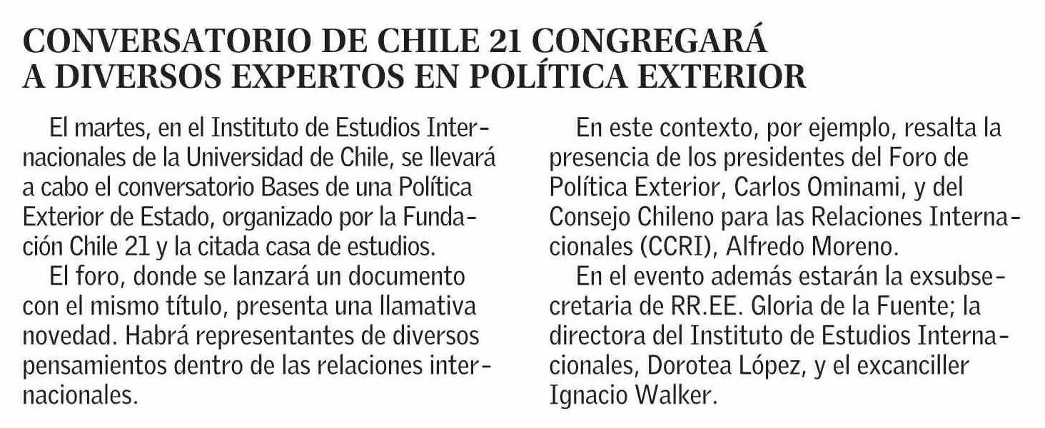 CONVERSATORIO DE CHILE 21 CONGREGARÁ A DIVERSOS EXPERTOS EN POLÍTICA EXTERIOR 19-04-2026 El Mercurio |