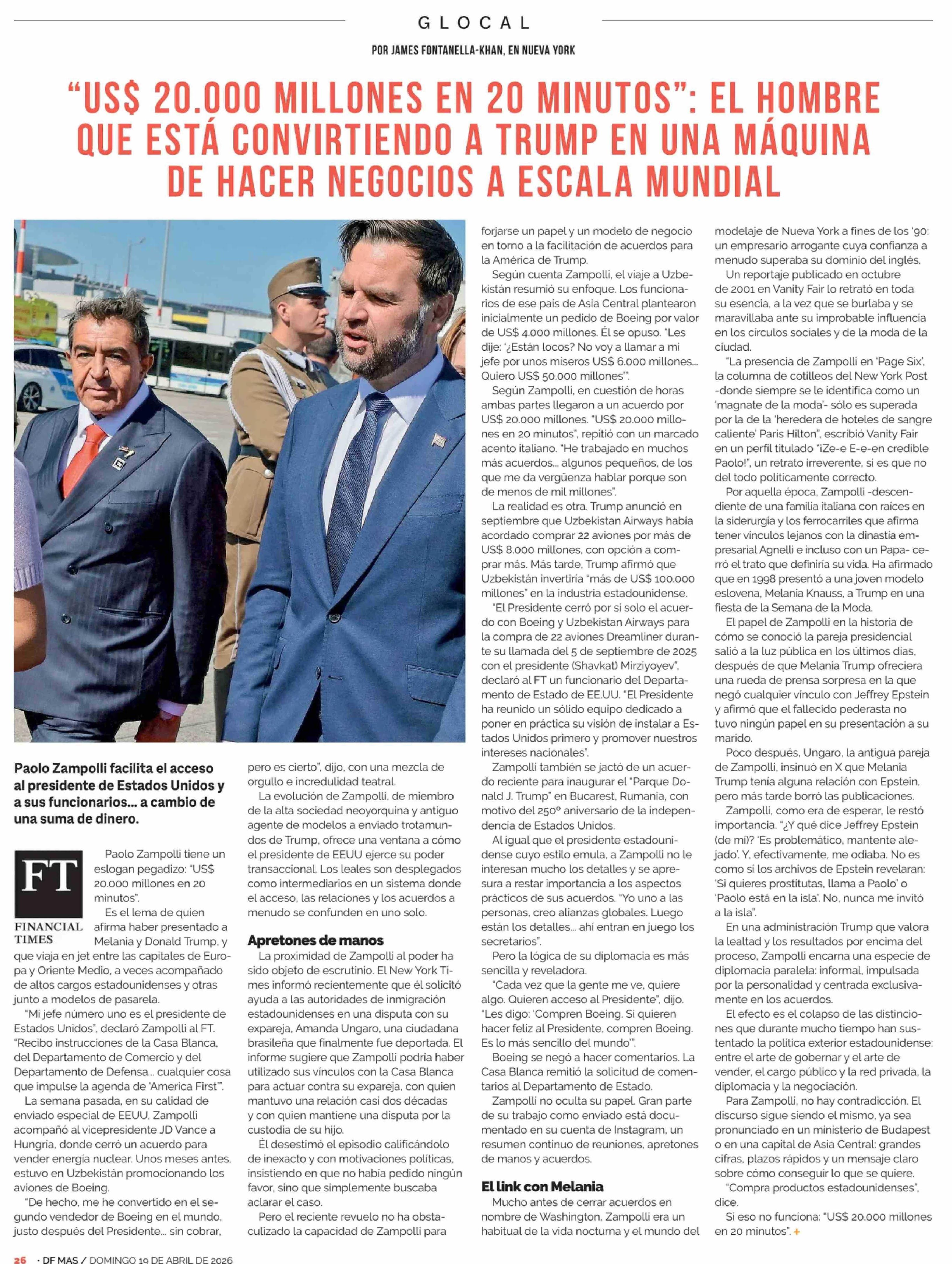 "US$ 20.000 MILLONES EN 20 MINUTOS": EL HOMBRE QUE ESTÁ CONVIRTIENDO A TRUMP EN UNA MÁQUINA DE HACER NEGOCIOS A ESCALA MUNDIAL 19-04-2026 Diario Financiero |